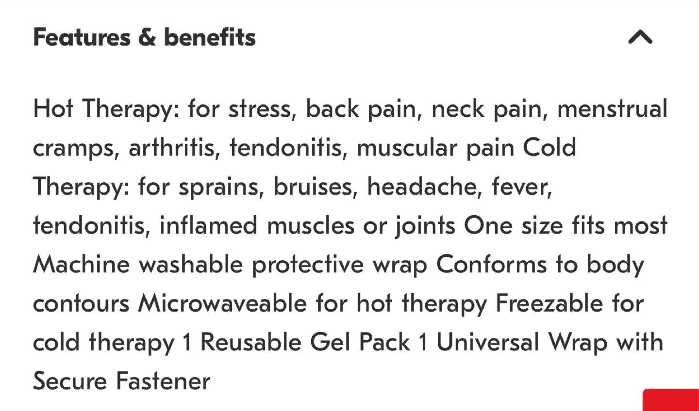 Includes 1 hot or cold gel pack and 1 universal wrap with a secure fastener. Perfect for cold therapy for sprains, bruises, headaches, fever, and more, and hot therapy for stress, back pain, neck pain, and more!