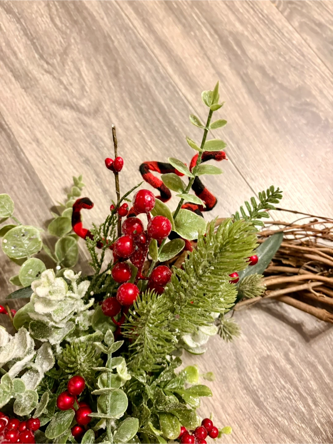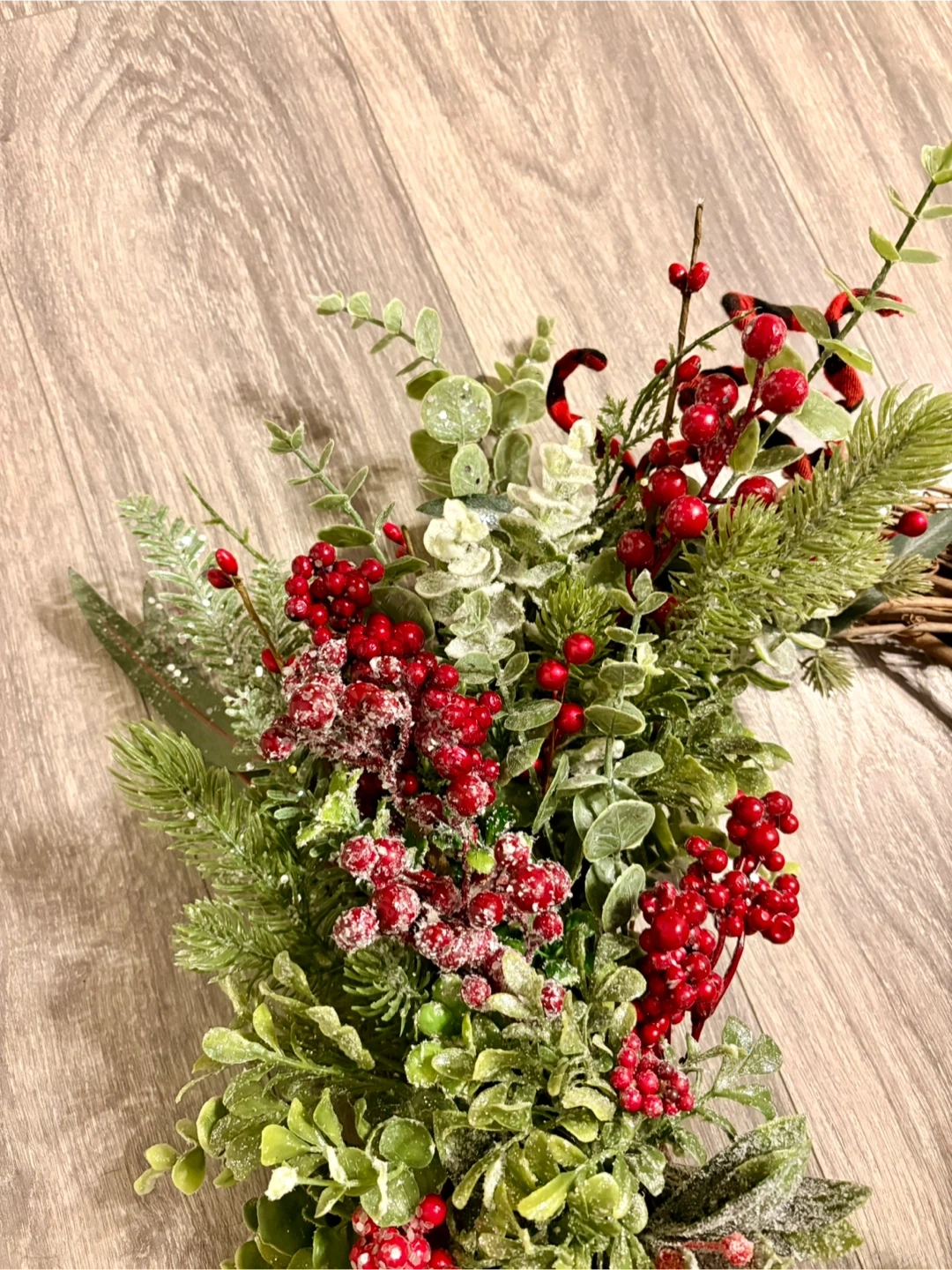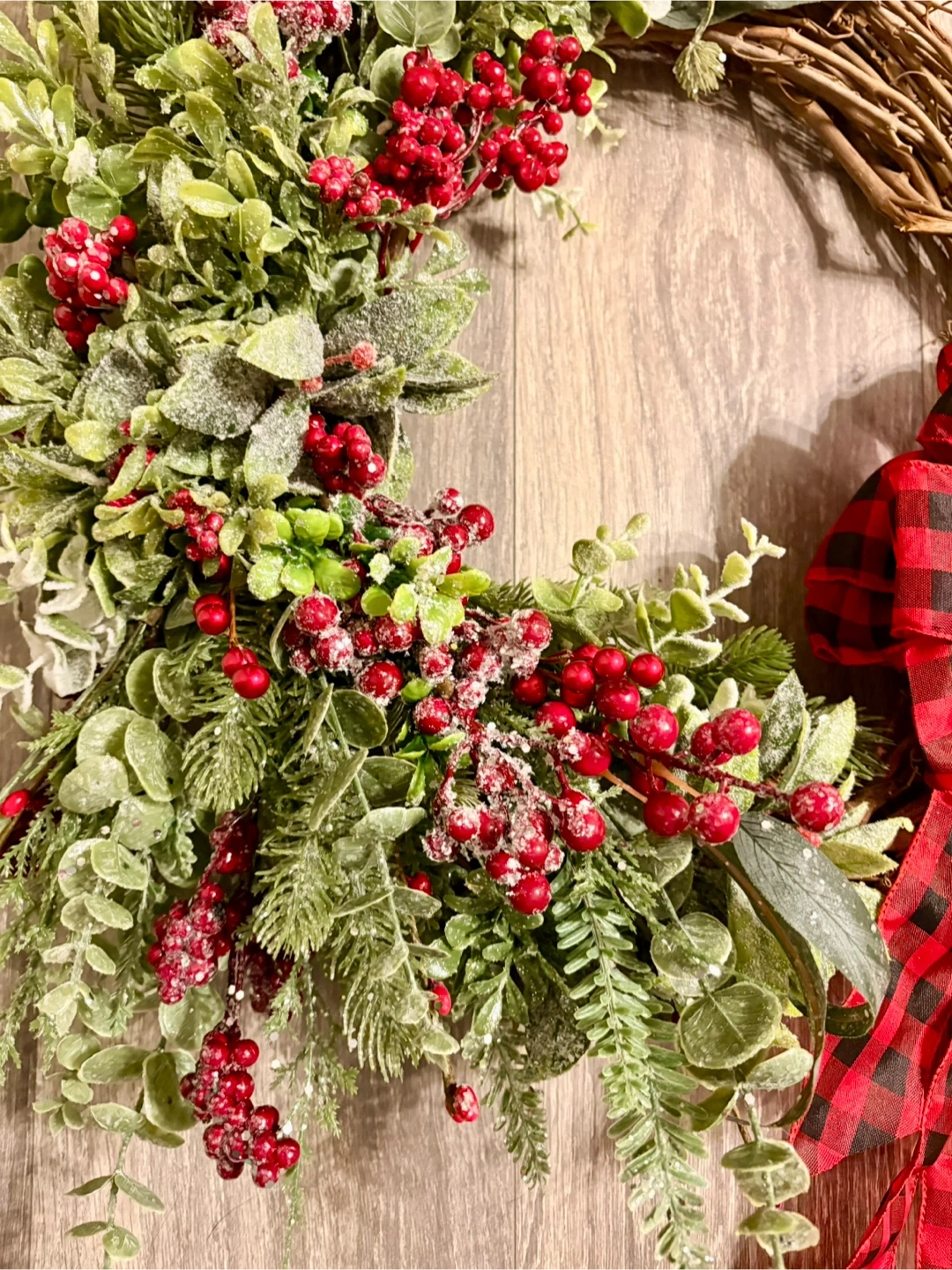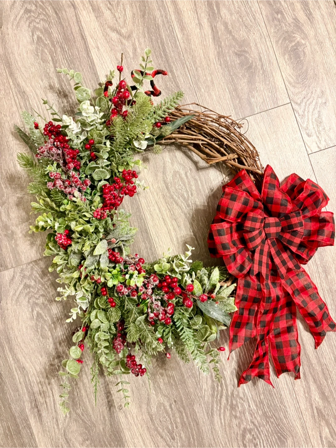 Selling a beautiful handmade holiday wreath! It features a rustic grapevine base adorned with lush greenery, vibrant red berries, and a festive buffalo plaid bow. Perfect for adding a touch of seasonal charm to your home!