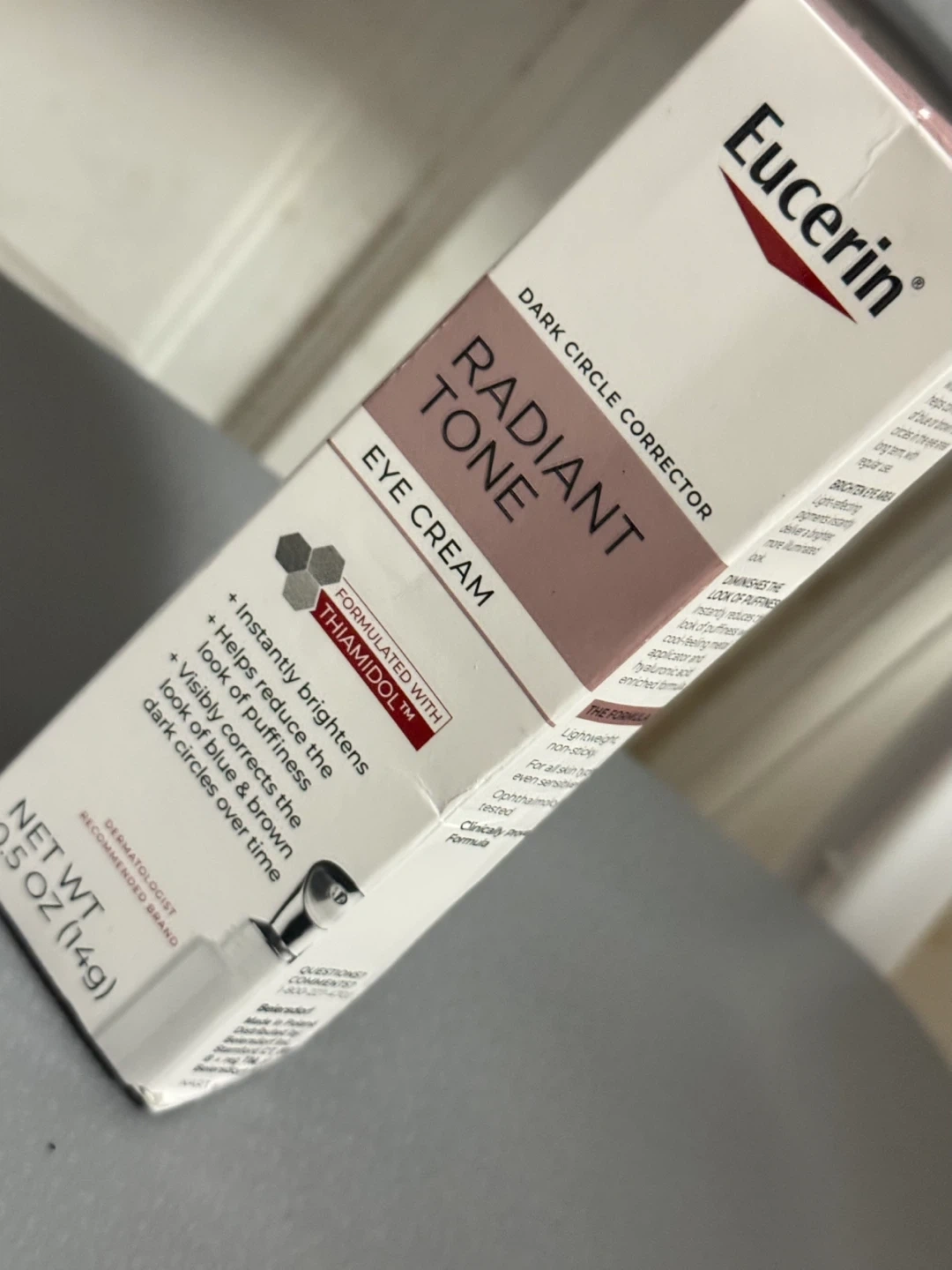 -Im selling Eucerin Radiant Tone Dark Circle Corrector Eye Cream. It visibly corrects the look of blue & brown dark circles over time and instantly brightens the look of puffiness. It's lightweight, non-sticky, and ophthalmologist tested. Net weight is 0.5 oz (14g)
