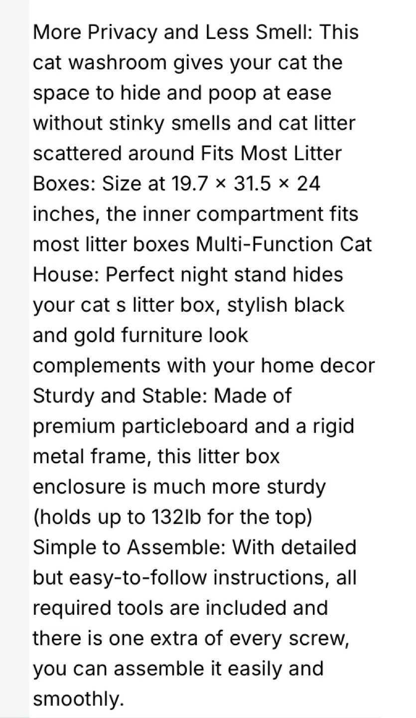 This cat litter box enclosure is perfect for giving your cat some privacy and reducing odours in your home. It's made of sturdy particleboard with a rigid metal frame, and can hold up to 132lb on top. The inner compartment fits most litter boxes. It's easy to assemble with the included instructions and tools. Needed to add stock pictures as item is brand new in box and needs to be assembled. Please contact if you are a serious buyer and can pick up near the border of Brampton and Caledon. 5 min drive , off hwy 410 Mayfield exit