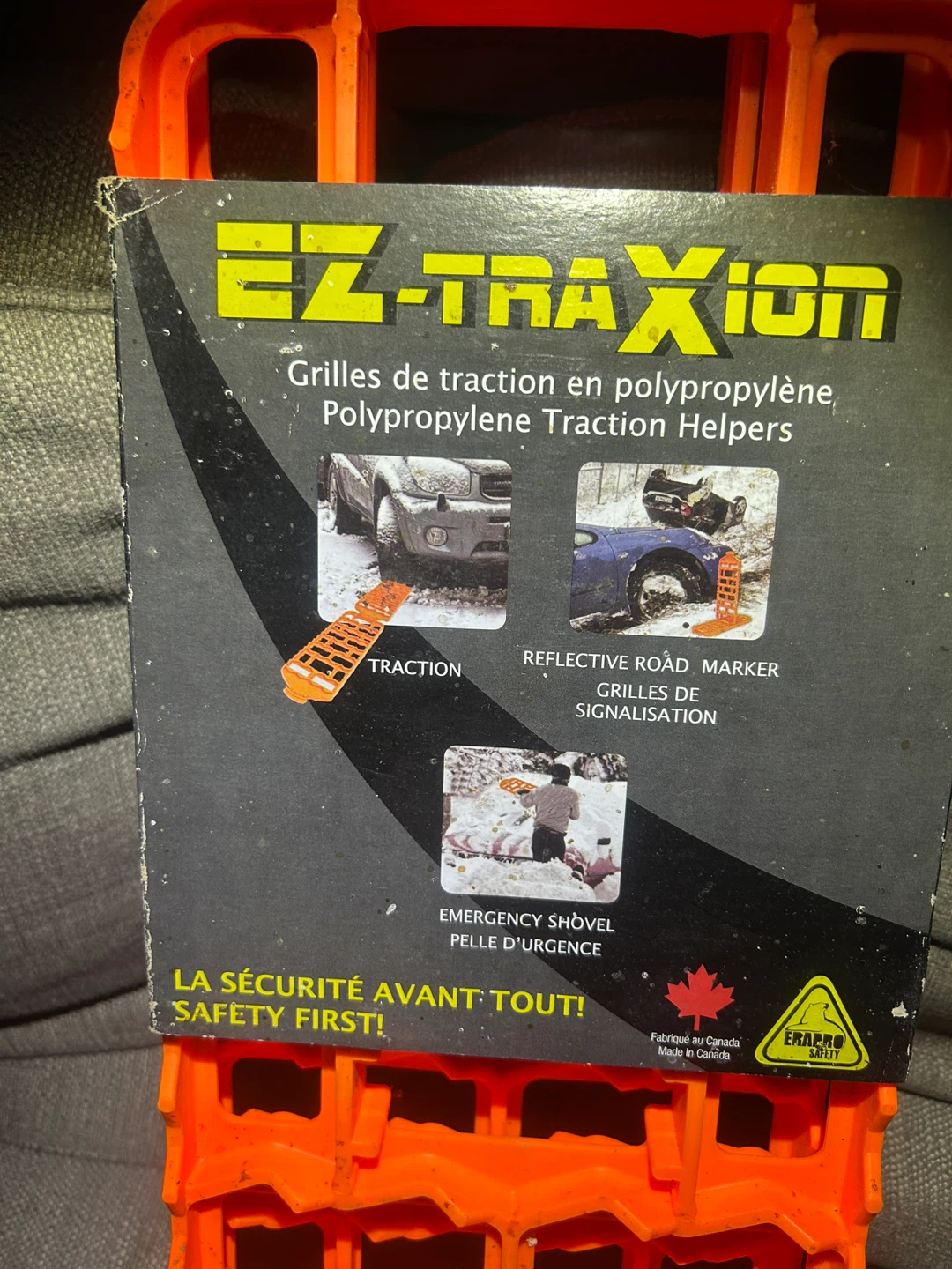 EZ-Traxion grilles de traction en polypropylène. These traction helpers provide traction on slippery surfaces and are ideal for use on snow, ice, and mud. They fit all vehicles and require no assembly. Can be used as an emergency shovel. Two heavy duty, high visibility traction helpers. Reflective roadside marker. Snaps easily together for longer traction path