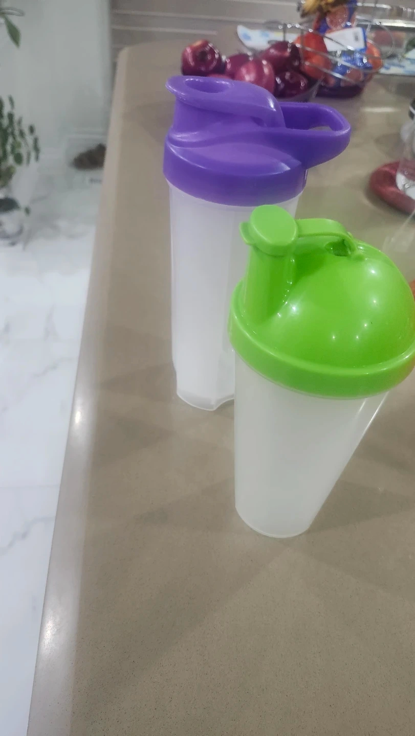 Guvibg away two shaker bottles, one with a green lid and the other with a purple lid. They're perfect for mixing protein shakes or any other drinks on the go