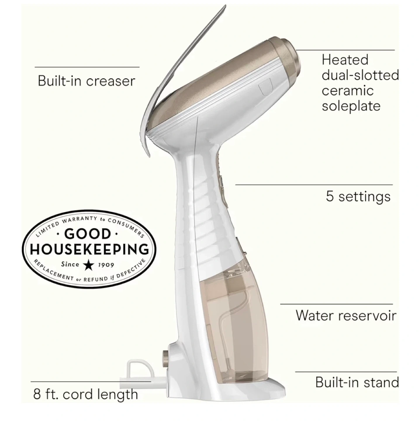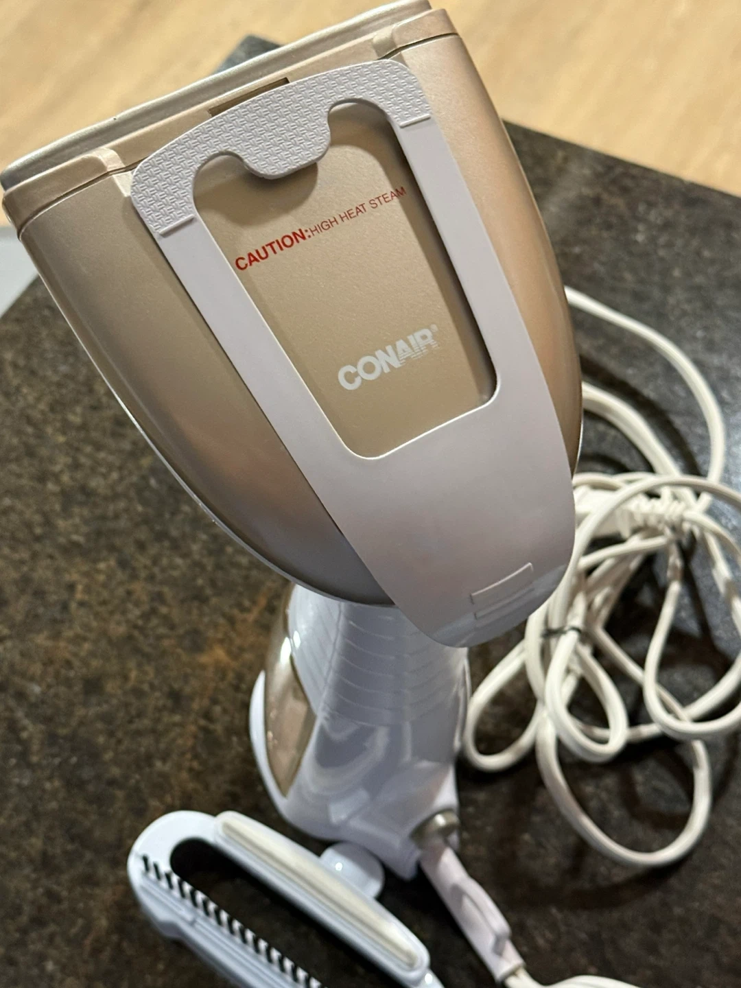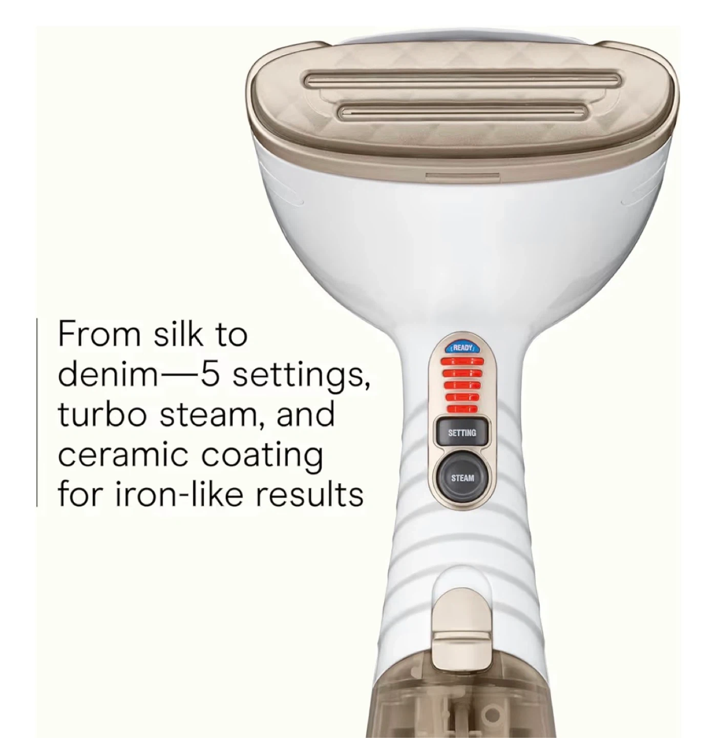 I'm selling a Conair handheld garment steamer in a stylish white and beige color scheme! This steamer is designed to handle everything from silk to denim, offering 5 different settings to suit your fabric needs. It also features turbo steam and a ceramic coating for iron-like results.