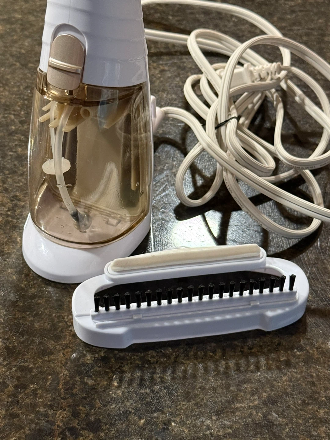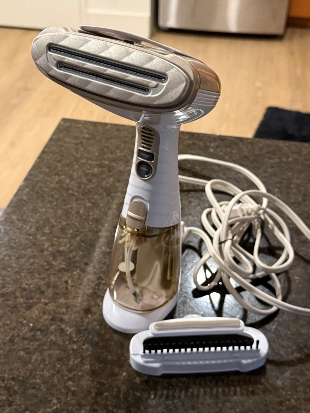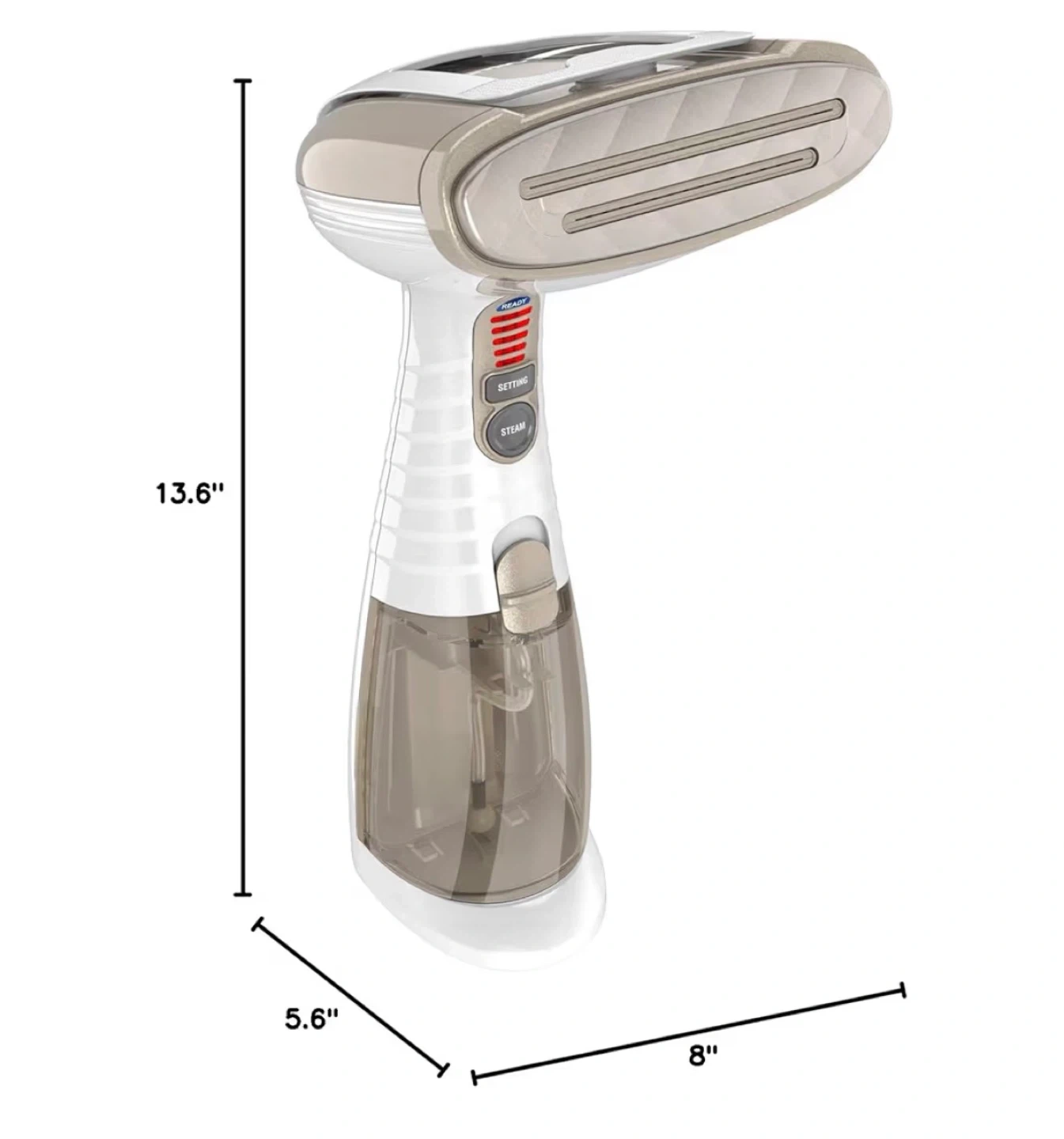 I'm selling a Conair handheld garment steamer in a stylish white and beige color scheme! This steamer is designed to handle everything from silk to denim, offering 5 different settings to suit your fabric needs. It also features turbo steam and a ceramic coating for iron-like results.
