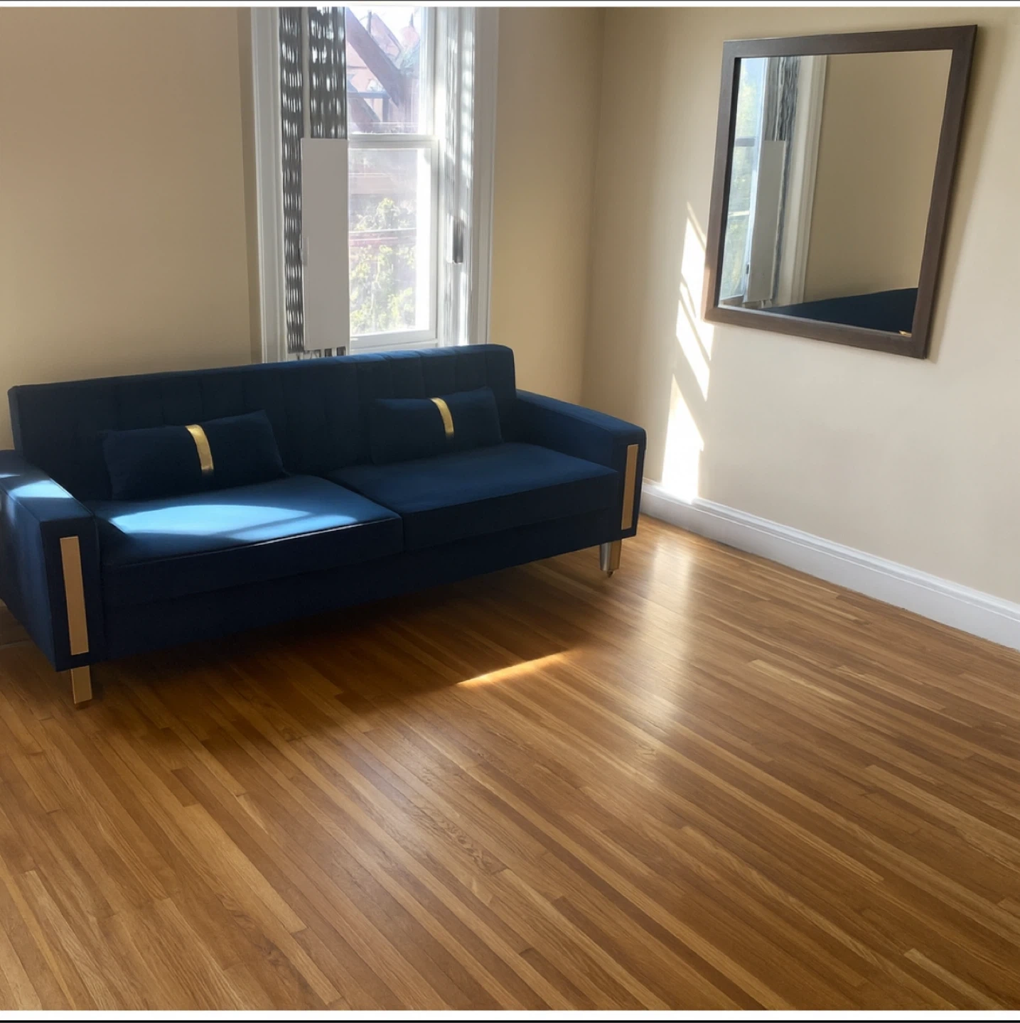 Selling a stylish blue velvet sofa! It's in great condition and would look lovely in any living room. The sofa has a modern design with gold accents on the legs and pillows. It's comfortable and perfect for lounging or entertaining guests