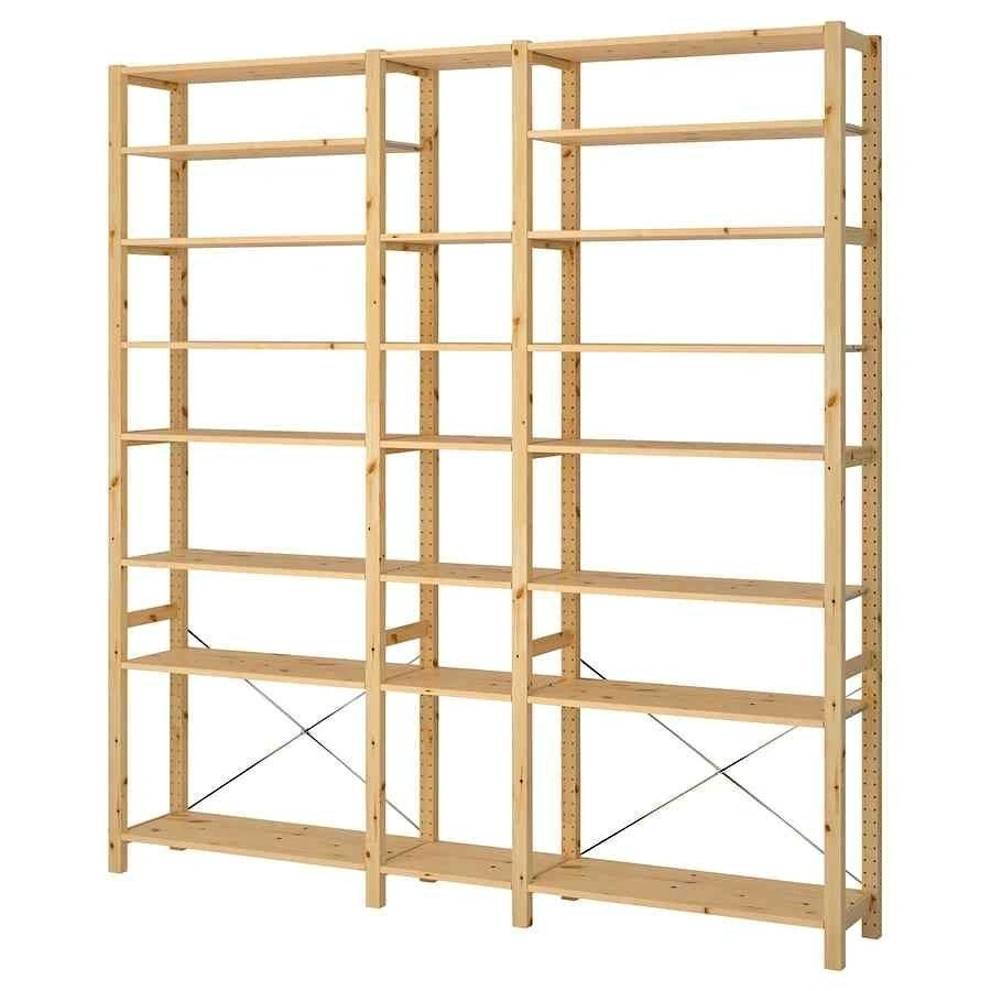 Image for illustration. Shelves are 89" tall, comes with 5 side pieces, 14 long shelves and 7 short, and two metal braces. Can easily be reconfigured into two units. Disassembled and ready for pickup.