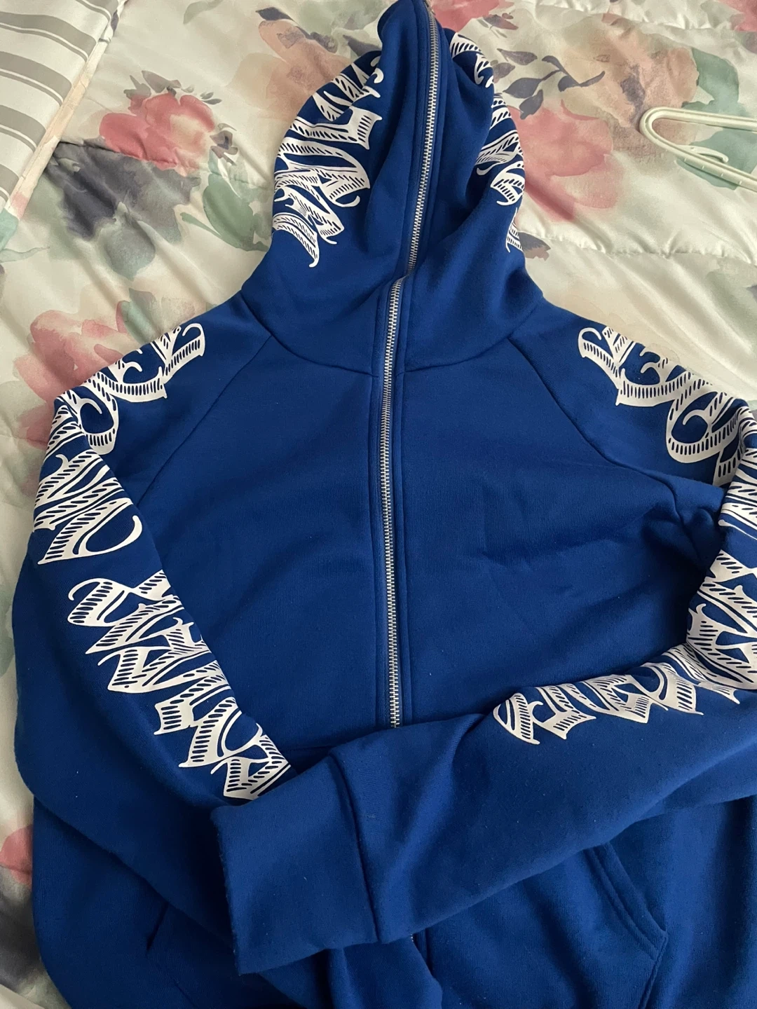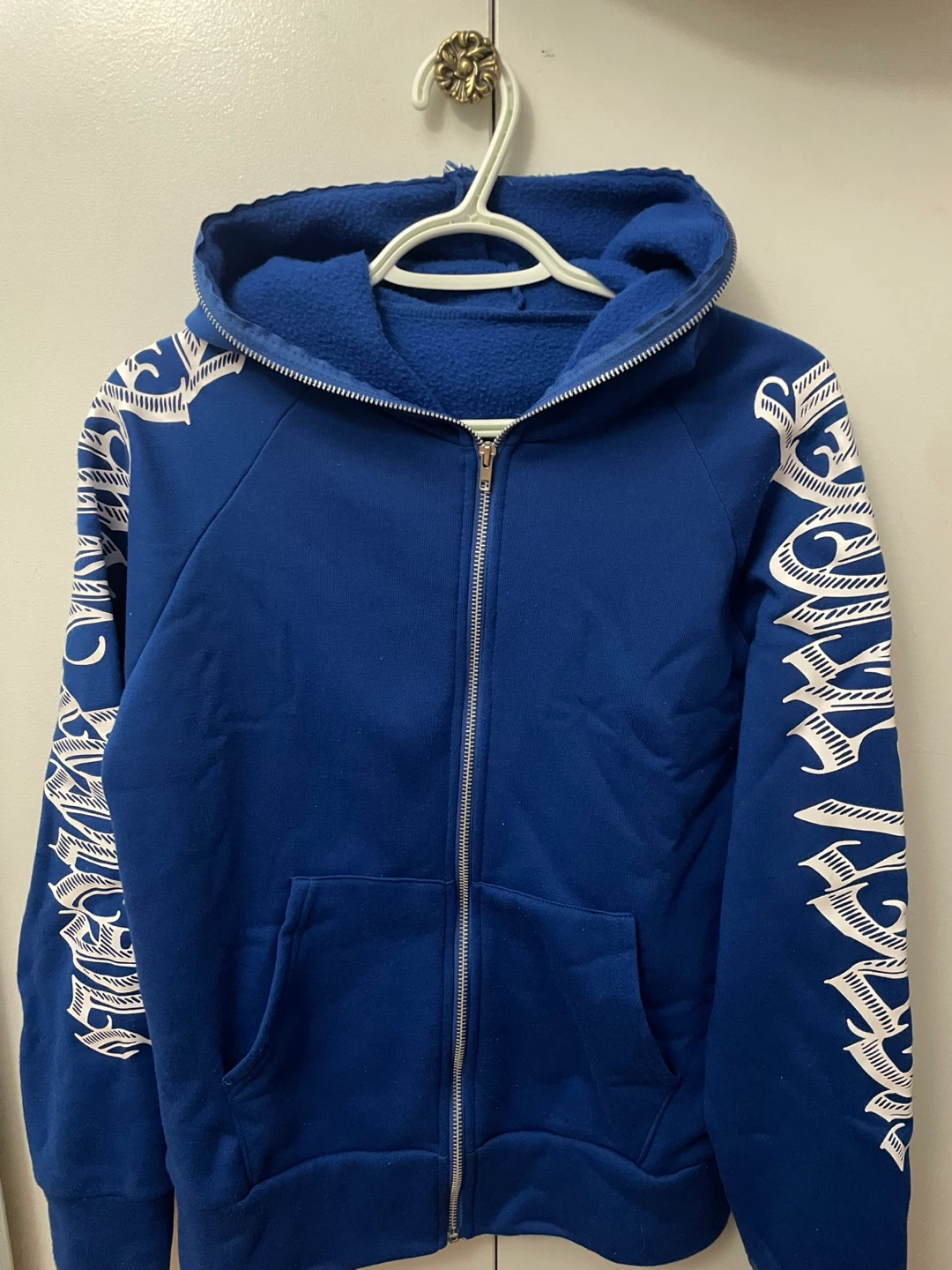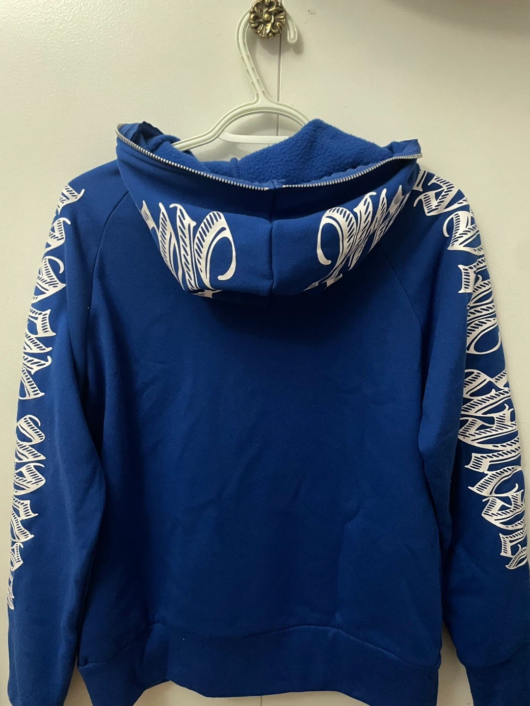 Here's a blue full-zip hoodie, perfect for layering or wearing on its own. It has a cool design on the sleeves and hood. It's in great condition and ready for a new home!