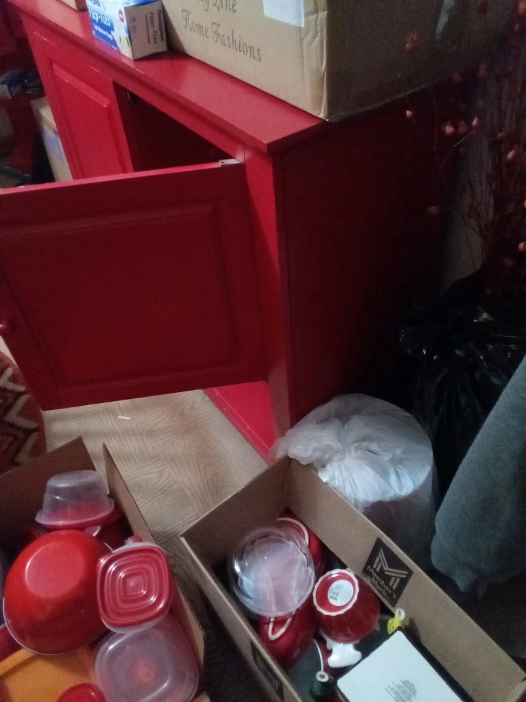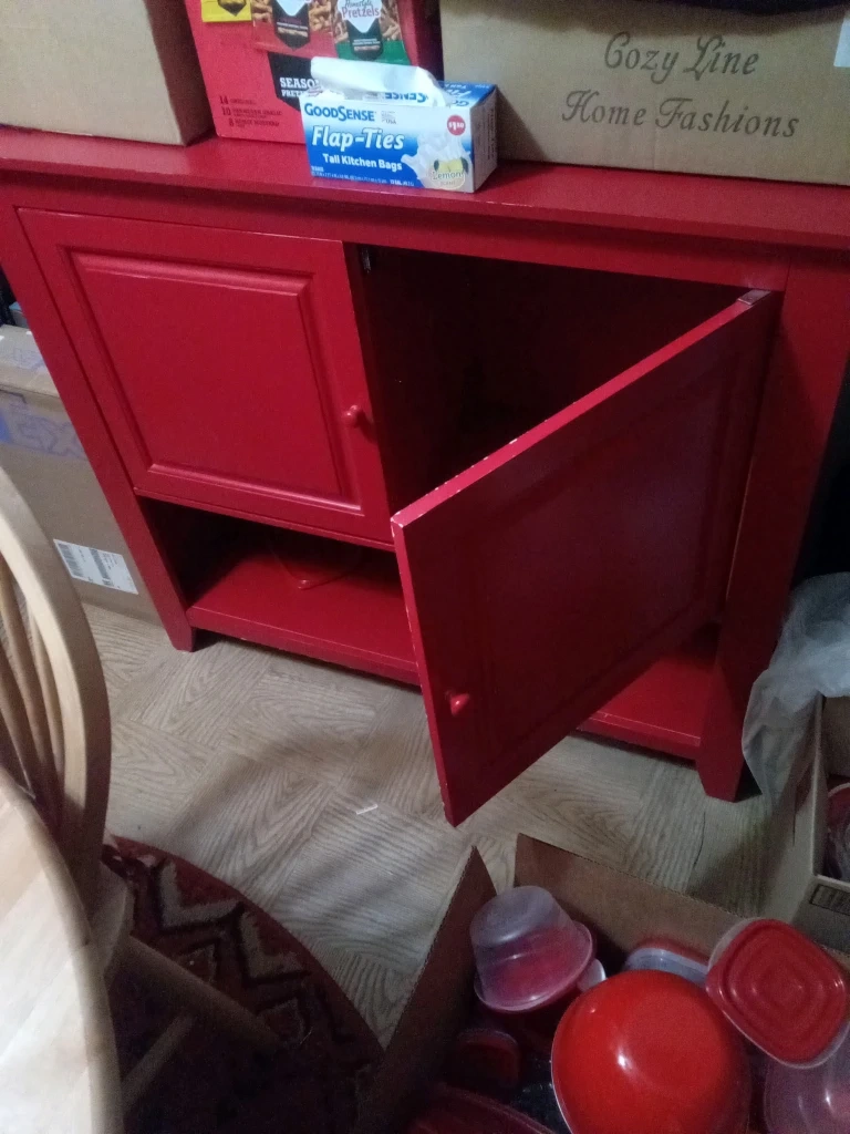 It has two shelves but there are only 6 pegs that hold the shelves up.Two are missing.Its painted red.The two top cabinets are uneven otherwise It is very sturdy.I can bring it to you to view if you live around Portage Park area, while I still have it in my car.