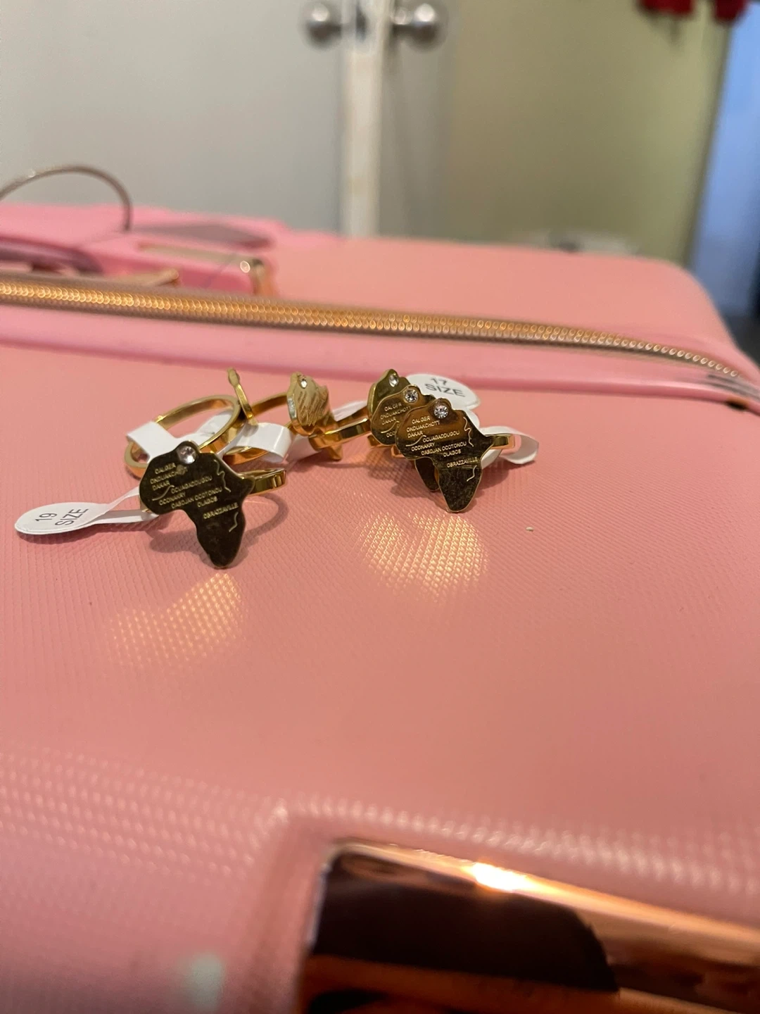 Selling a few rings with an Africa continent design. They are size 6 and have a gold colour. They have a small stone on them. Perfect for everyday wear!