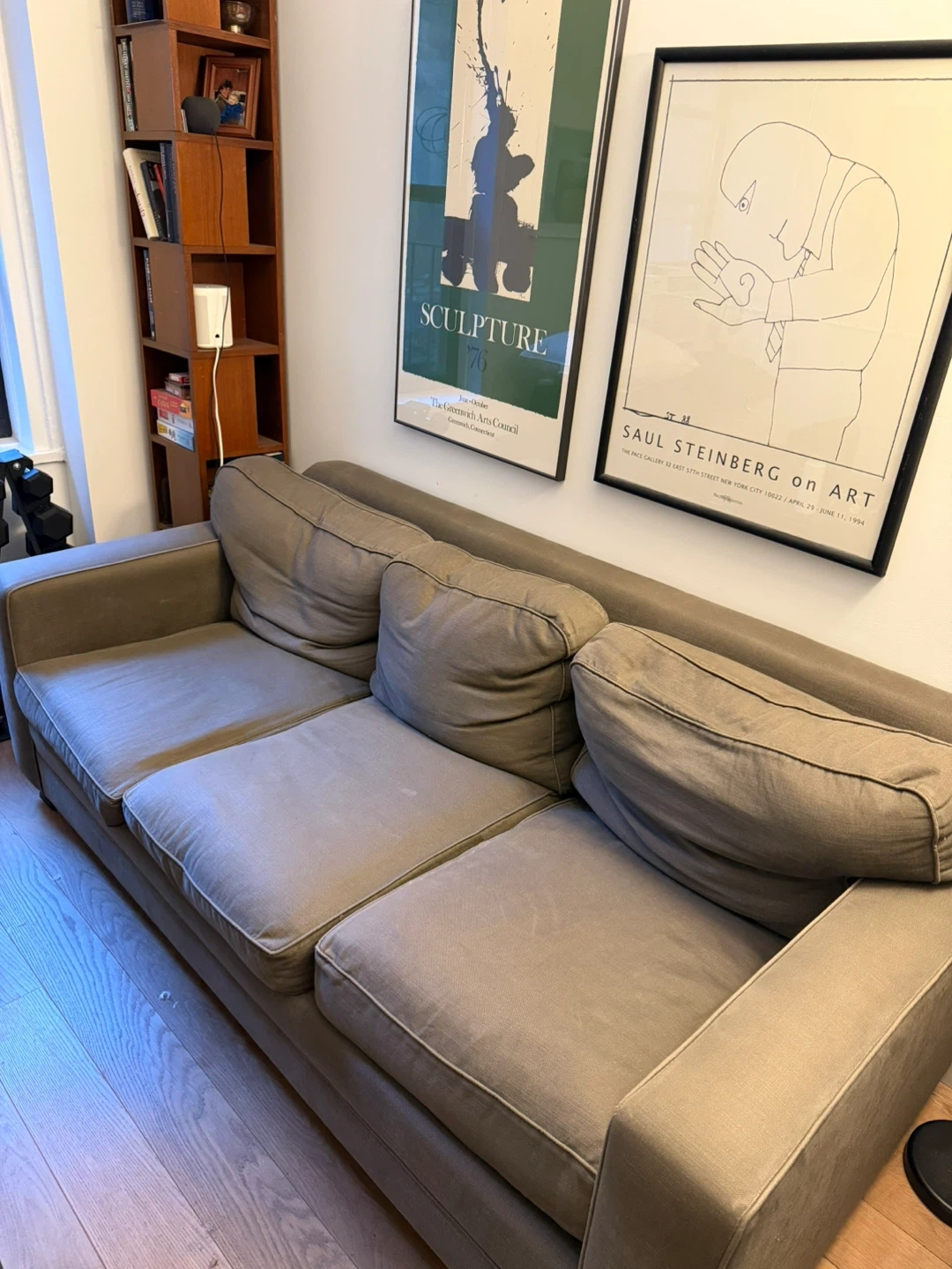 Selling a cozy three-seat sofa that's perfect for lounging! It has a neutral color that would fit well in any living room. The cushions are soft and inviting, making it a great spot to relax after a long day
