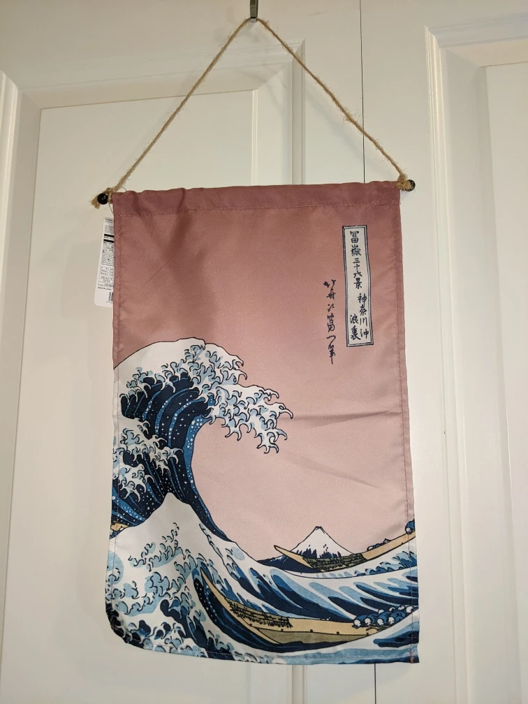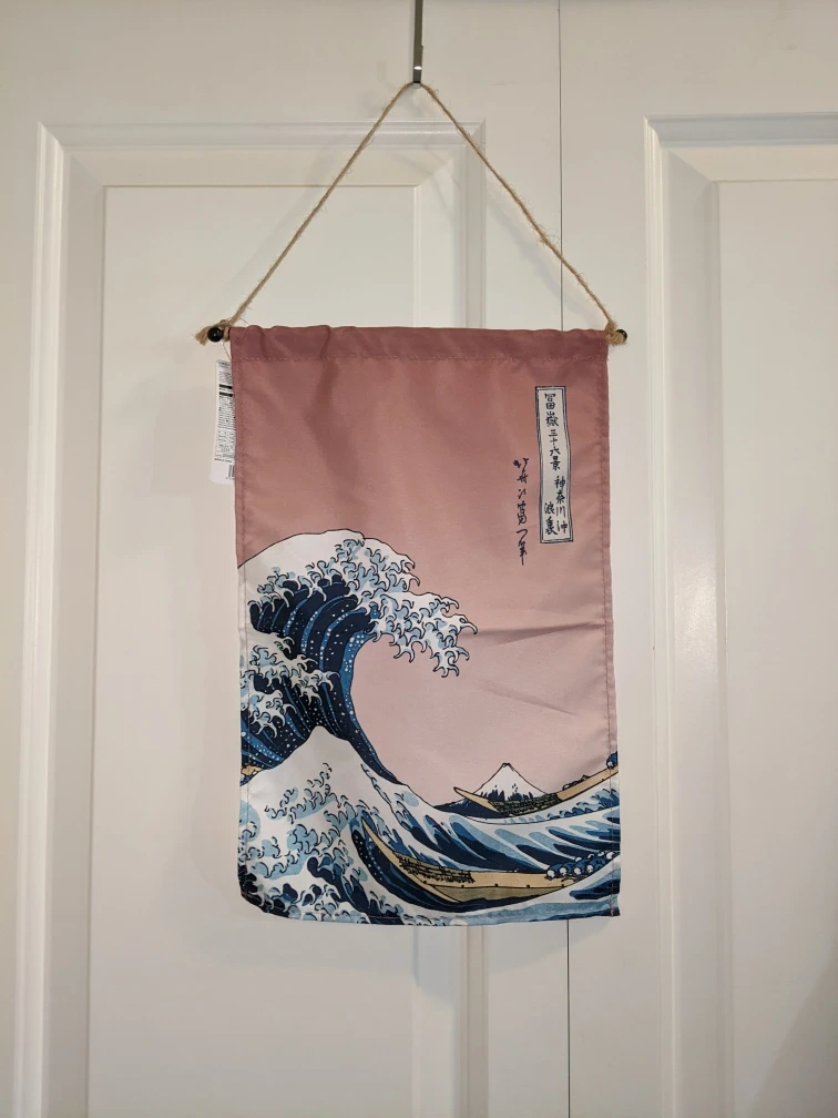 This wall hanging features the iconic artwork "The Great Wave off Kanagawa"! It's perfect for adding a touch of Japanese art to your space. The colours are soft and calming, and the material has a nice texture