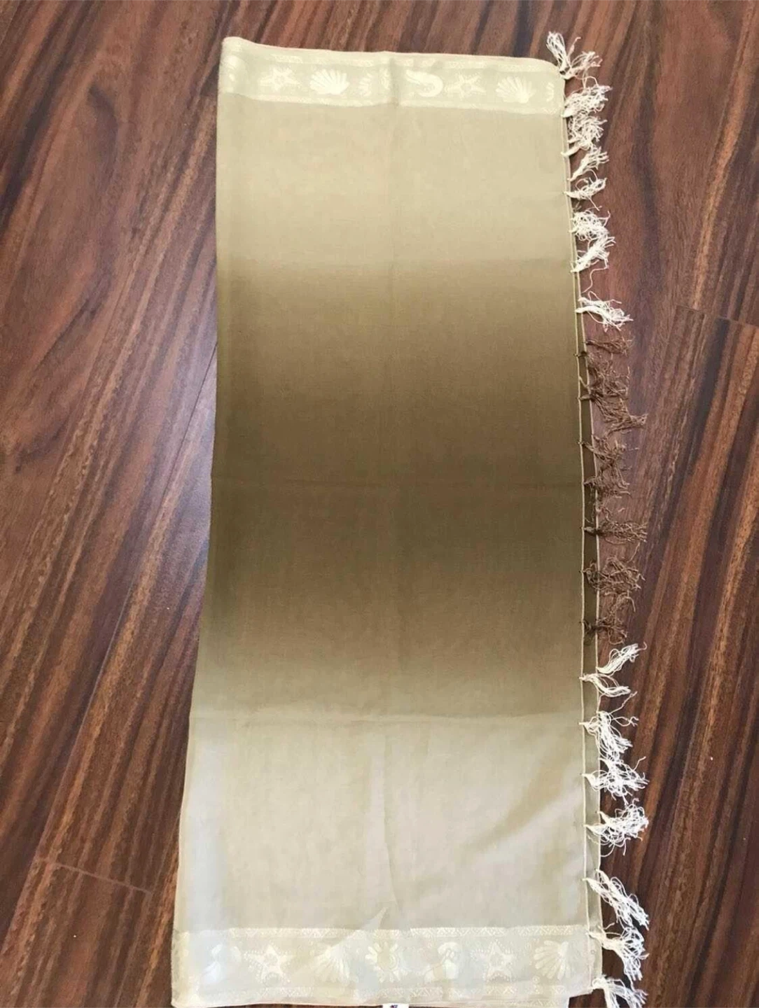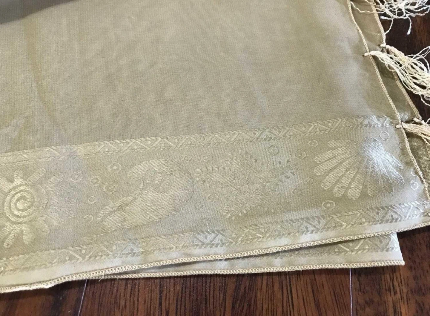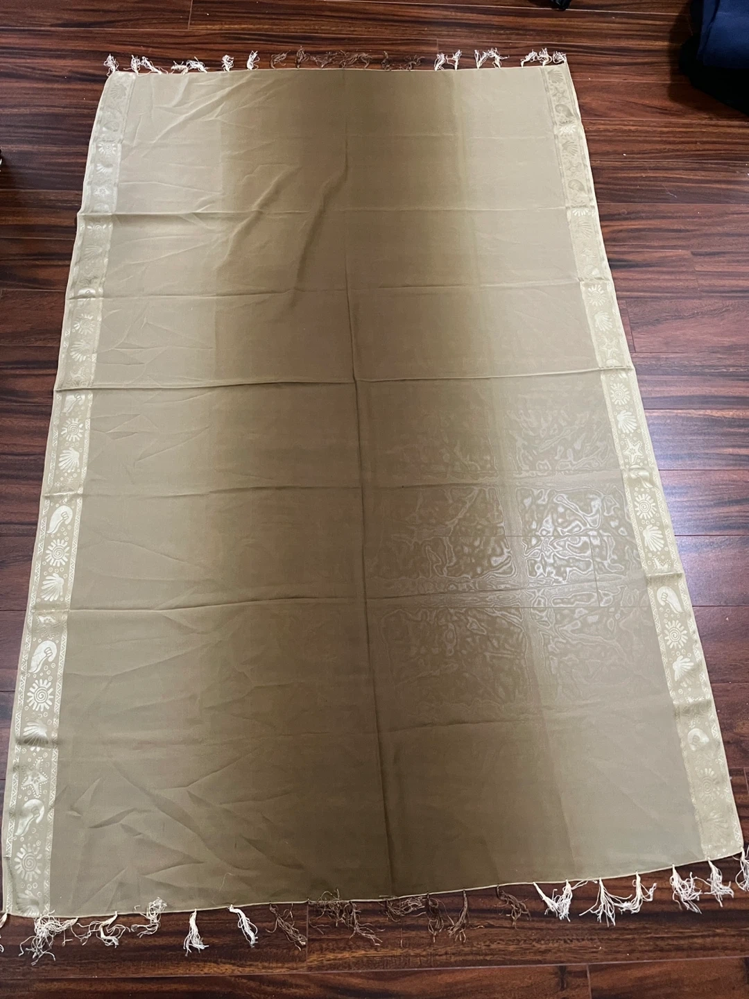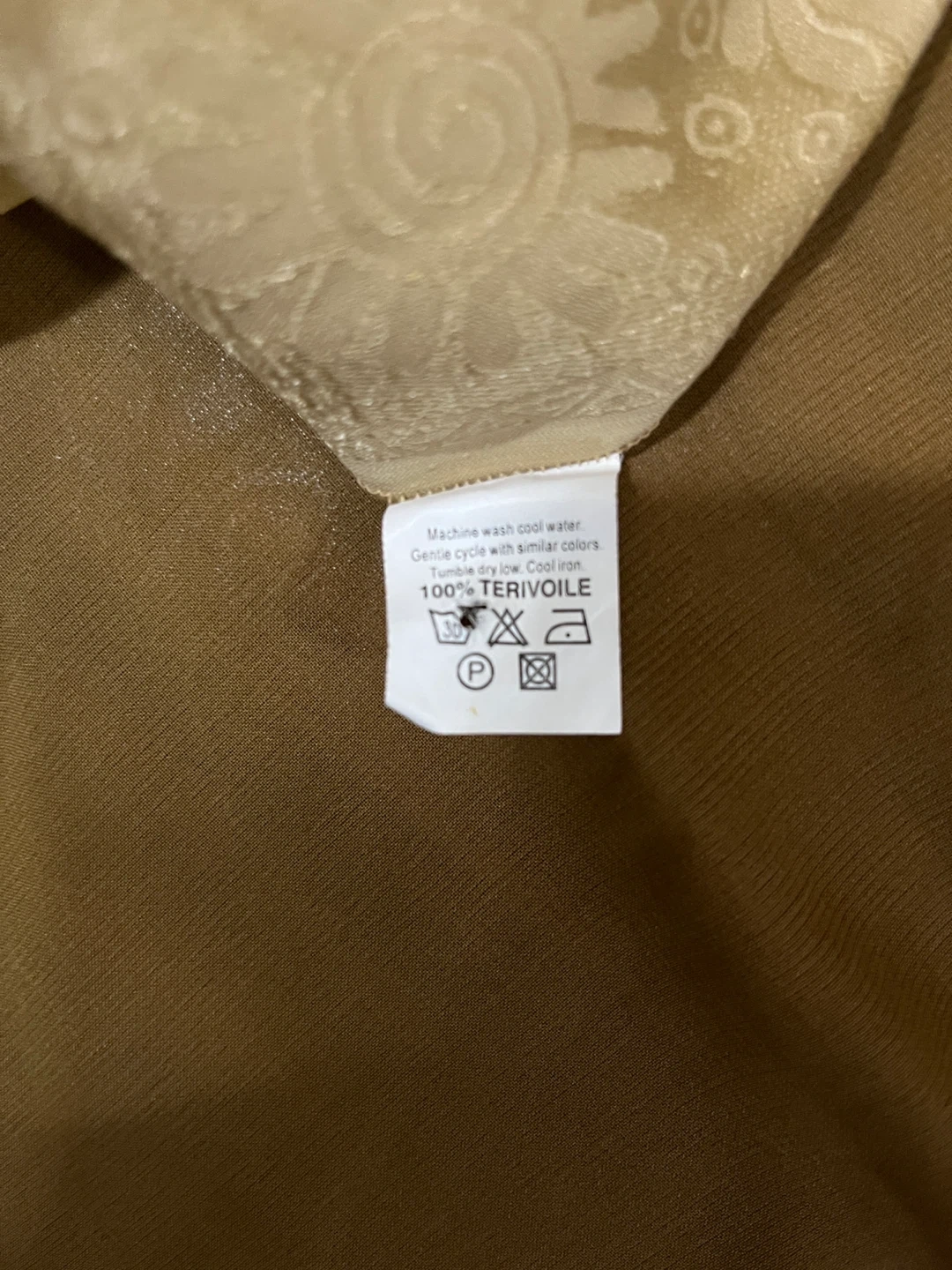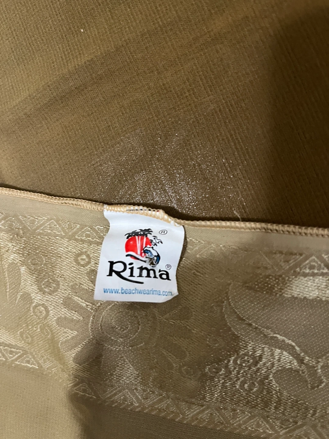 Rima women’s beach coverup in beige and brown ombré. Seashell panel along the long edge and fringe tassels on the short edge. Made of silky Terivoile fabric that mimics silk. Lightweight and perfect for travel or lounging. Like new condition.