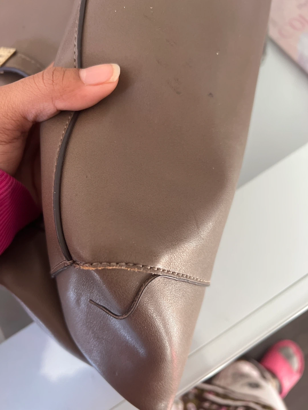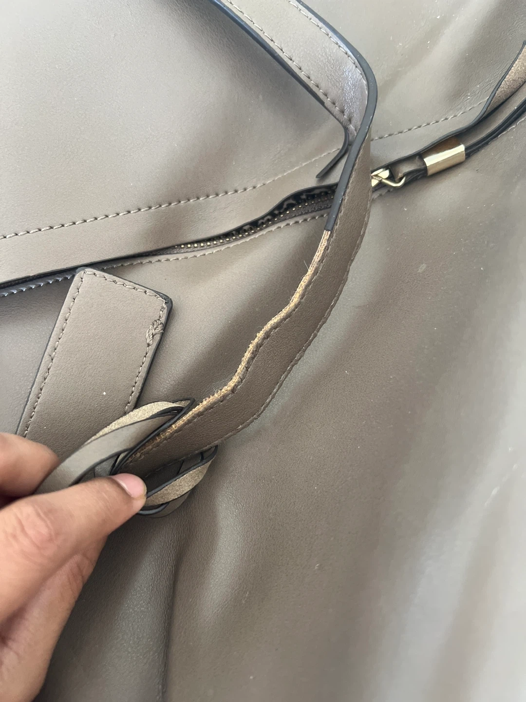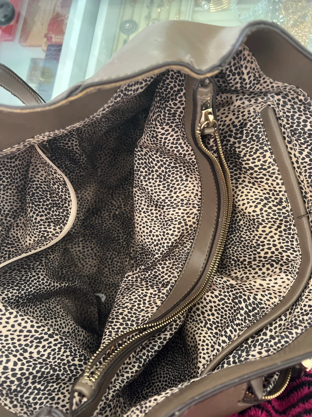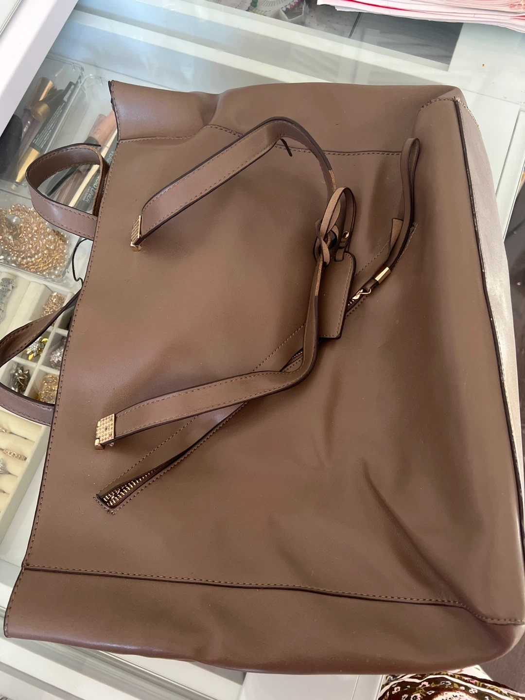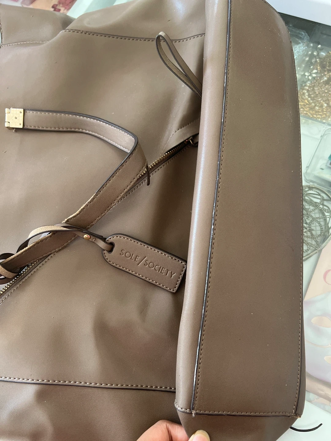 I'm selling a Sole Society tote bag in a lovely taupe color. It's a stylish and practical bag with a spacious interior and a unique patterned lining. There are some signs of wear on the handles and bottom, as shown in the pictures, but it's still a great bag for everyday use!