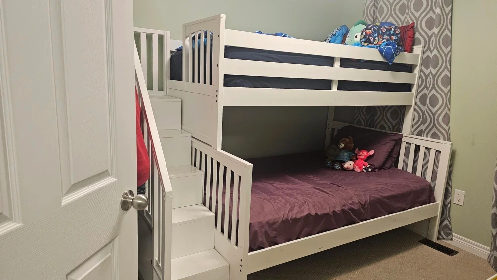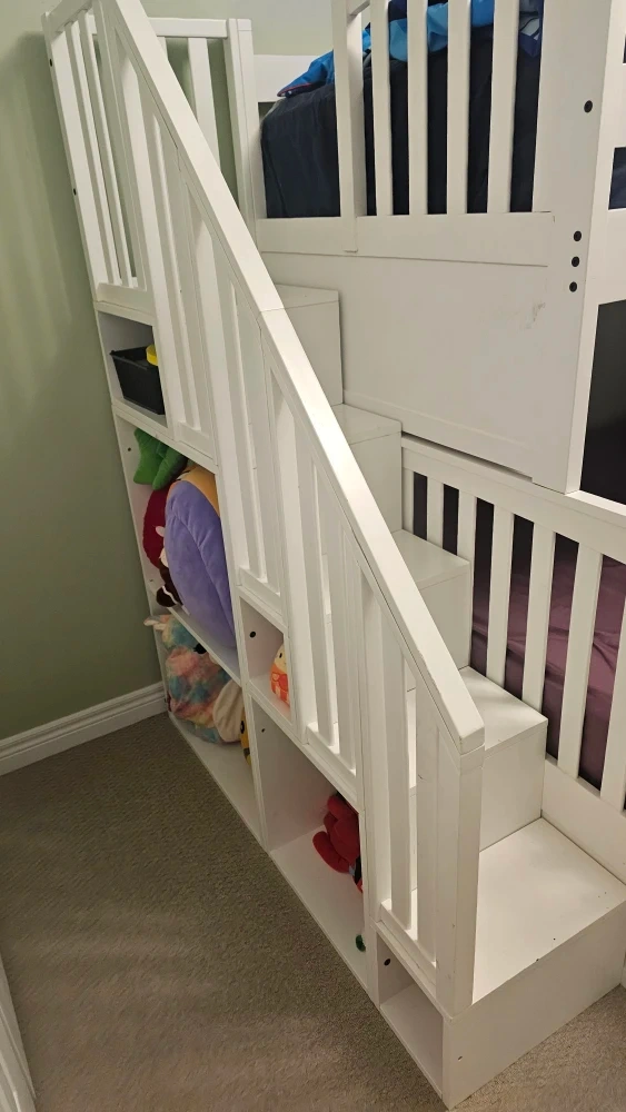 Selling a bunk bed with a stairway. It's in great condition and ready for a new home! The stairway has built-in storage, which is super handy for keeping things organized. The bunk bed is white, so it'll fit in with any room decor