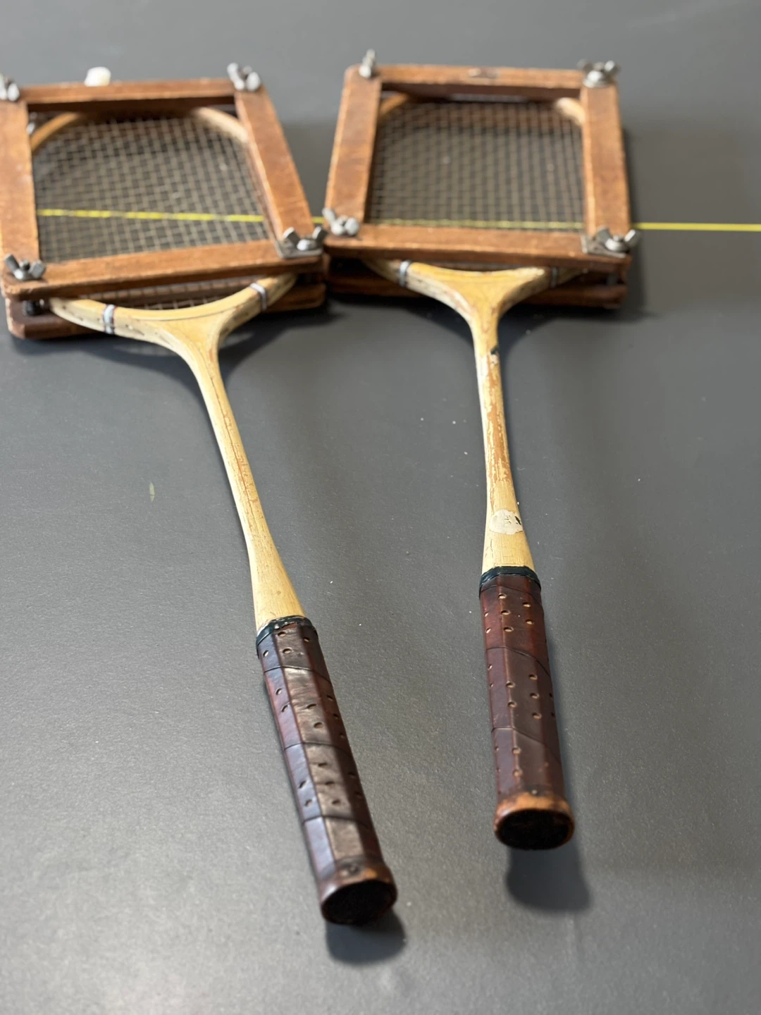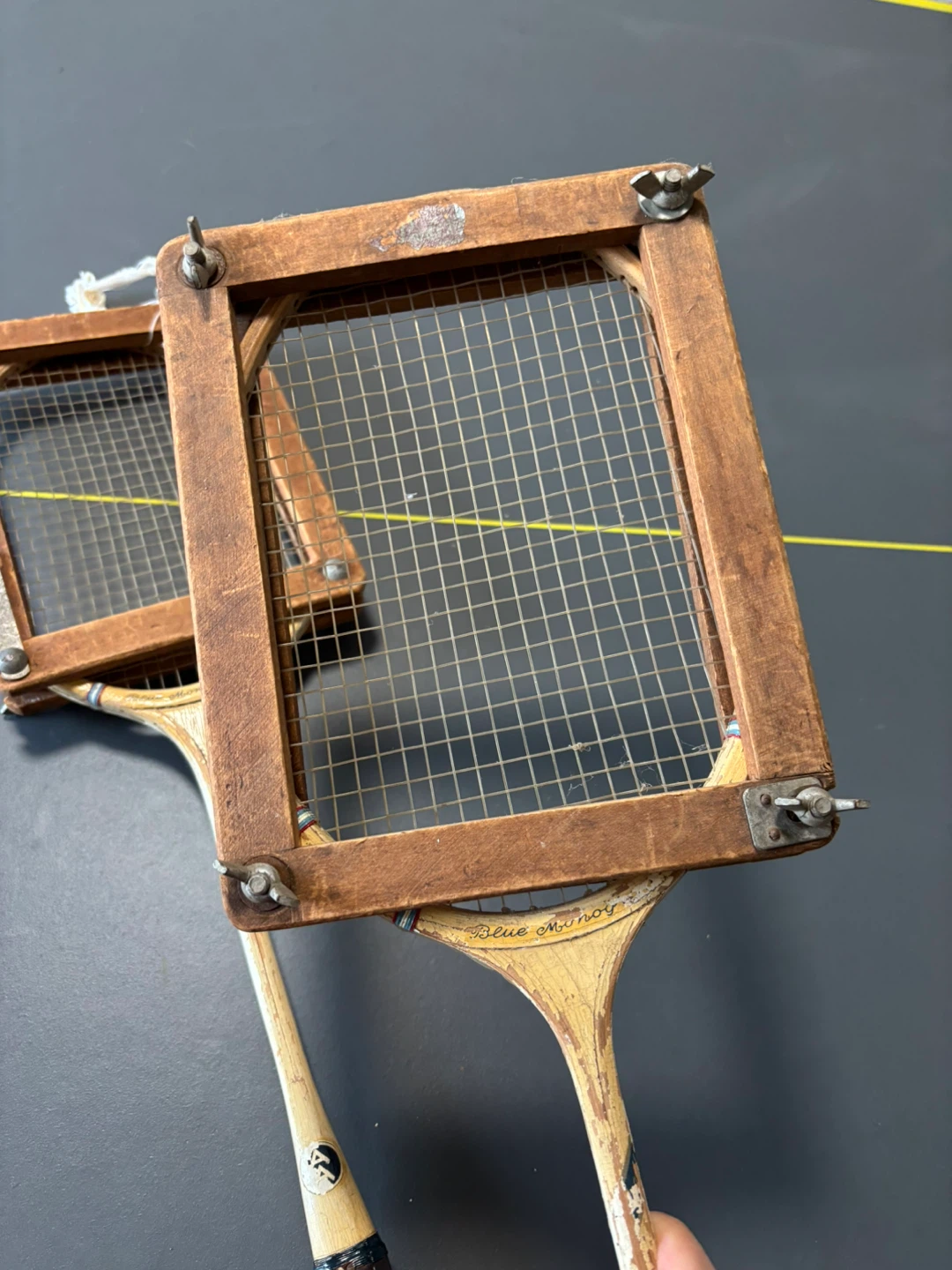 Selling a pair of vintage squash racquets from Blue Monogram! They have a unique wooden frame with a wire mesh face and brown leather handles. Great for collectors or anyone looking for a unique piece of sports history