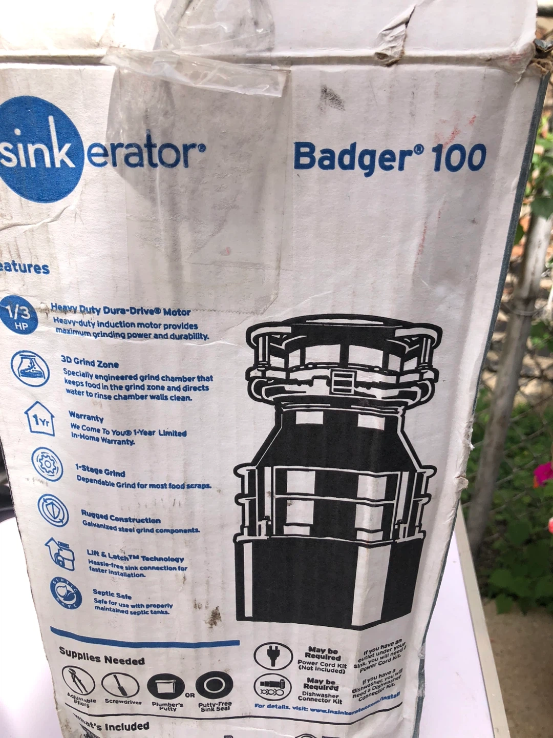 Selling a brand new InSinkErator Badger 100 garbage disposal still in its original box! This unit features a heavy-duty Dura-Drive motor for powerful grinding and durability. The 3D Grind Zone is specially engineered to keep food in the grinding area while directing water for easy cleaning. It's septic safe and features Lift & Latch technology for hassle-free sink connection