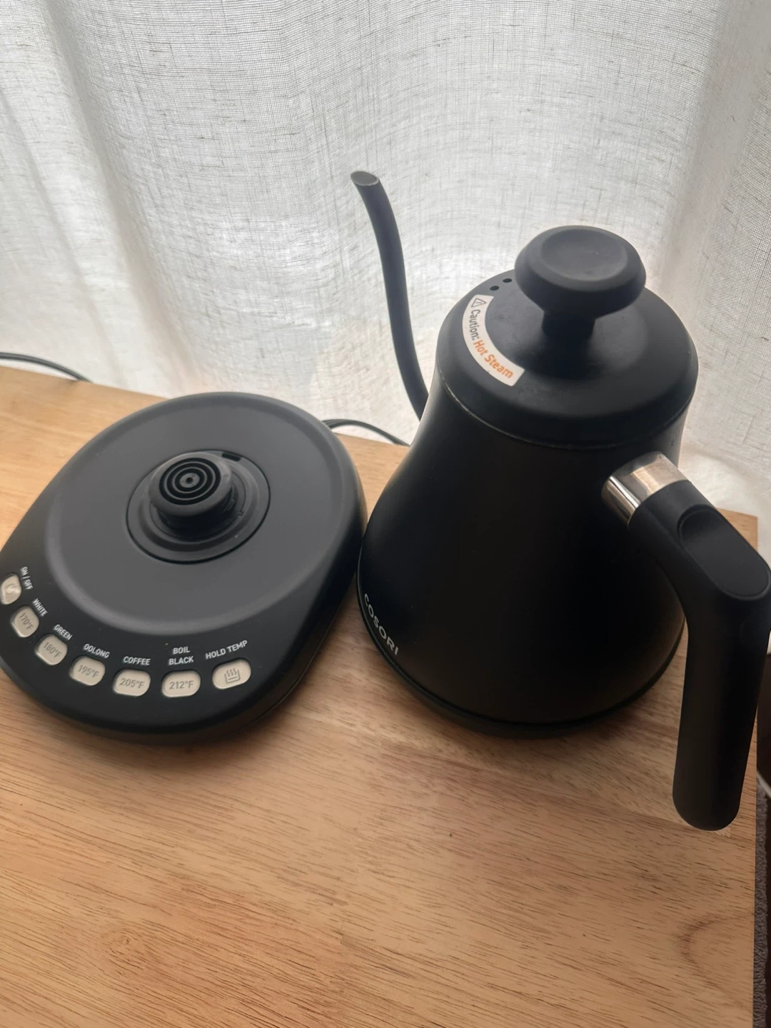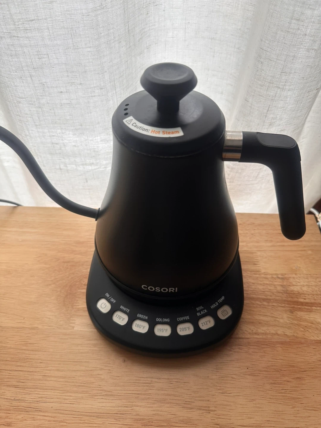 Selling a Cosori electric gooseneck kettle in black. It's in great condition and ready for your pour-over coffee needs!