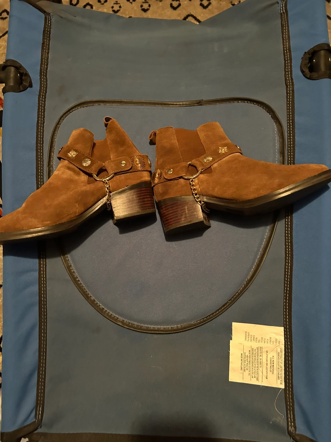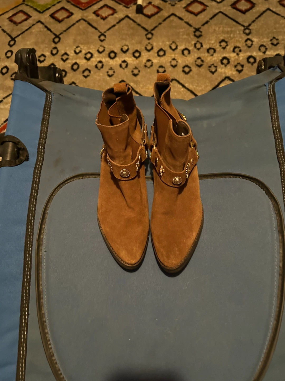 These brown suede ankle boots are in great condition and ready for a new home! They feature a decorative strap with metal accents and a comfortable block heel. Perfect for adding a touch of style to any outfit