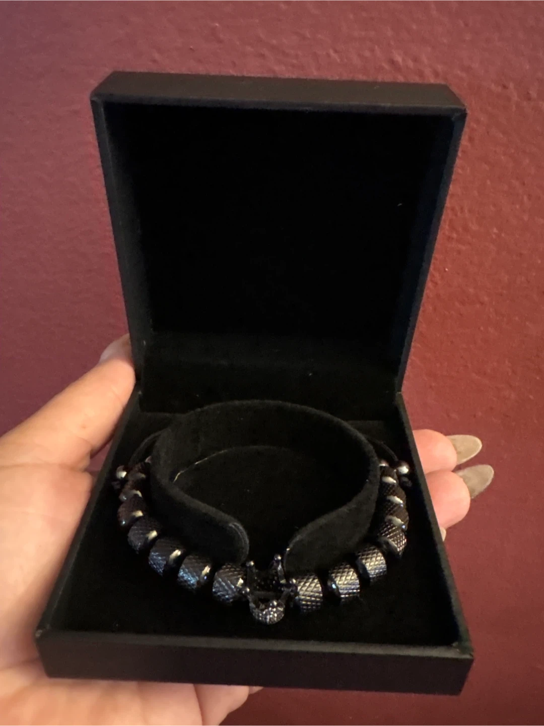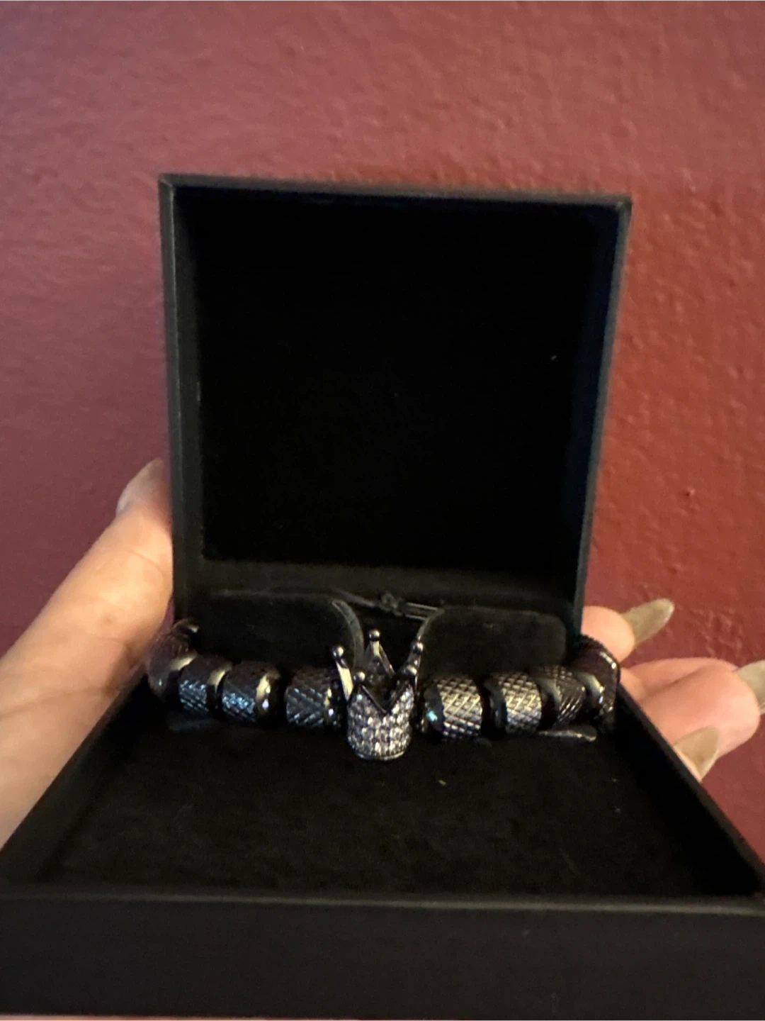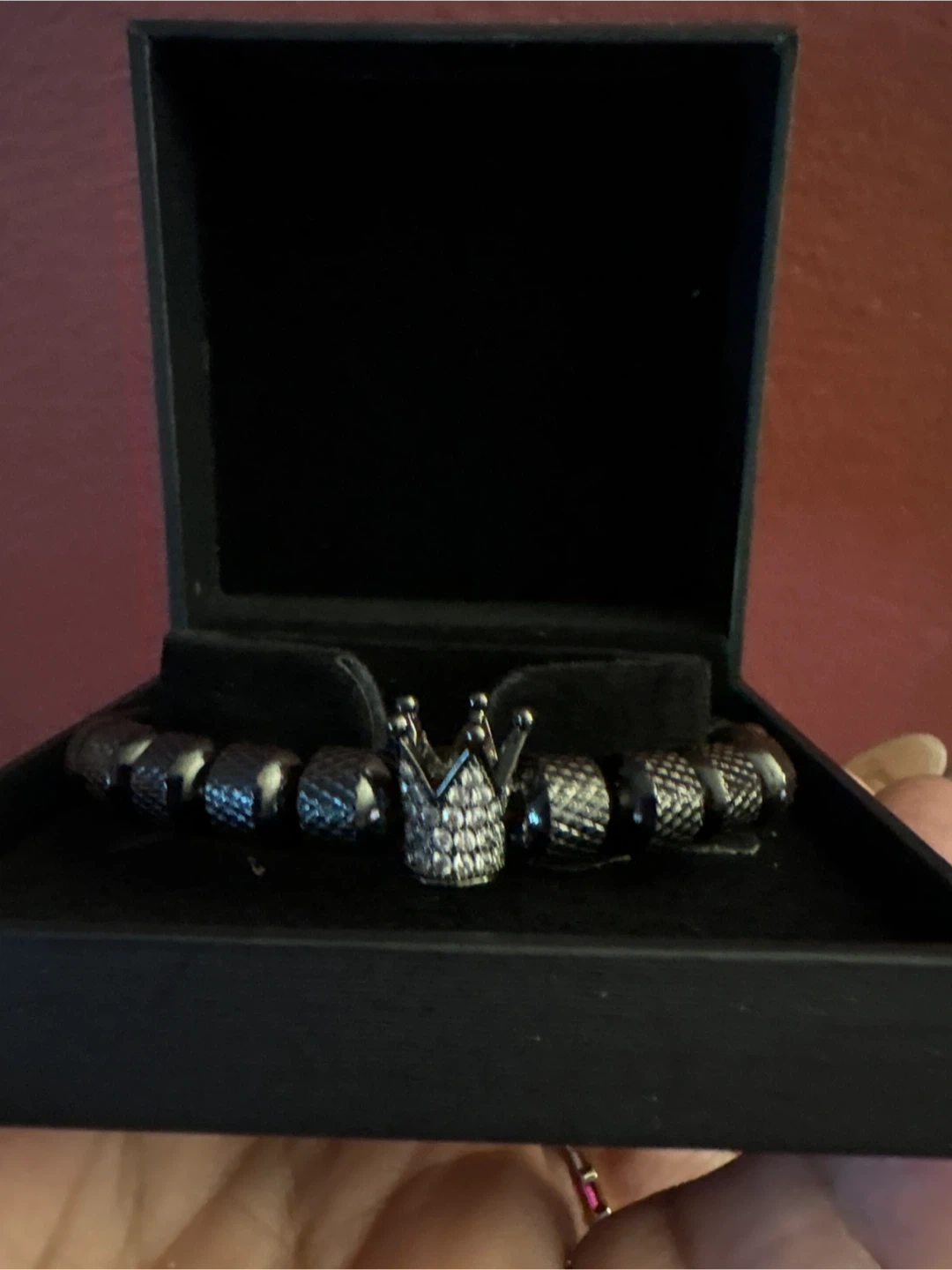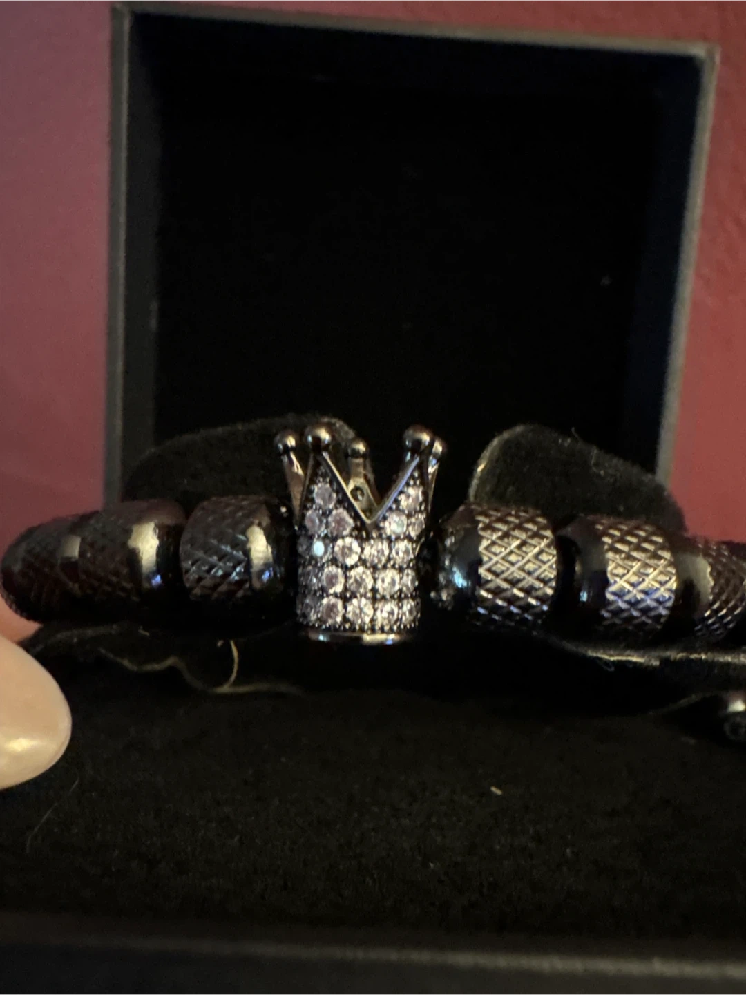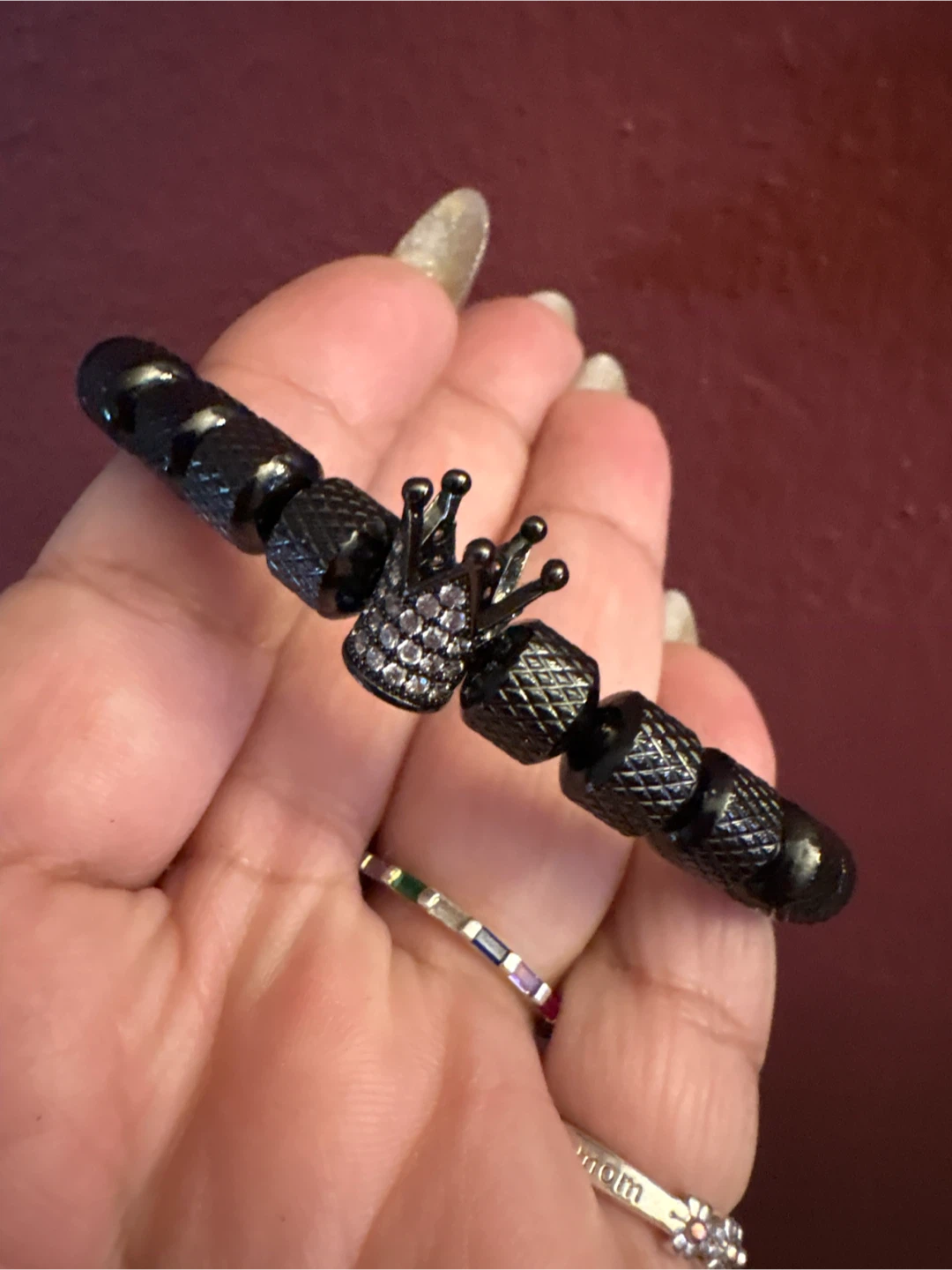 Here's a stylish men's black titanium steel CZ beaded bracelet. It features a crown charm and comes in its original box. Perfect for adding a touch of edgy elegance to any outfit!