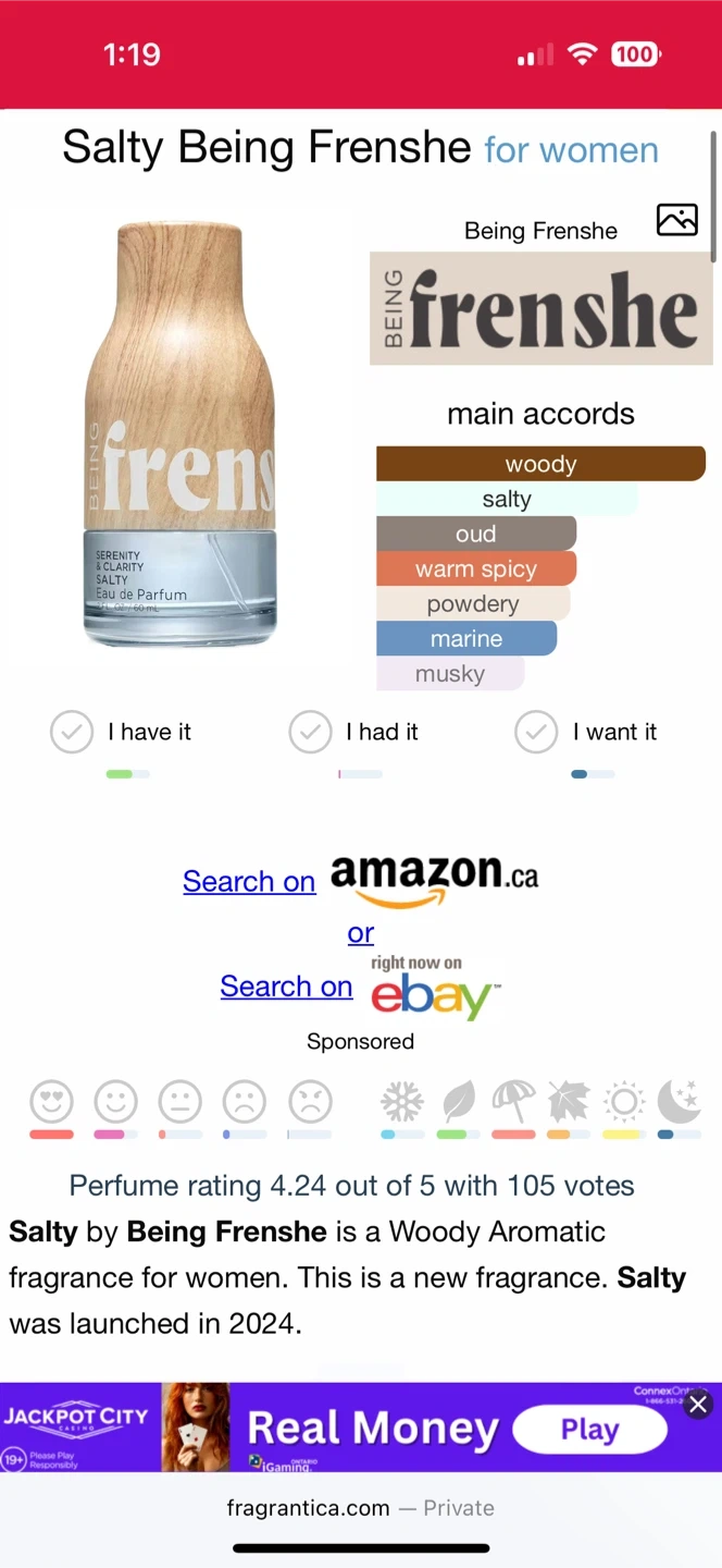 Selling a bottle (60ml) of Being Frenshe's Salty Eau de Parfum. It's a woody aromatic fragrance for women, launched in 2024. The main accords are woody, salty, oud, warm spicy, powdery, marine, and musky.