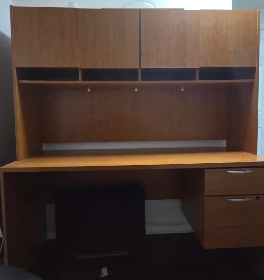 This desk is practically new and works great, especially with that storage up top. You can even take the cabinet off if you want to change things around. Plus, you get a free office chair, which makes this a really sweet deal. It's super practical and flexible for your workspace at home or office, giving you both style and usefulness. Price is negotiable.