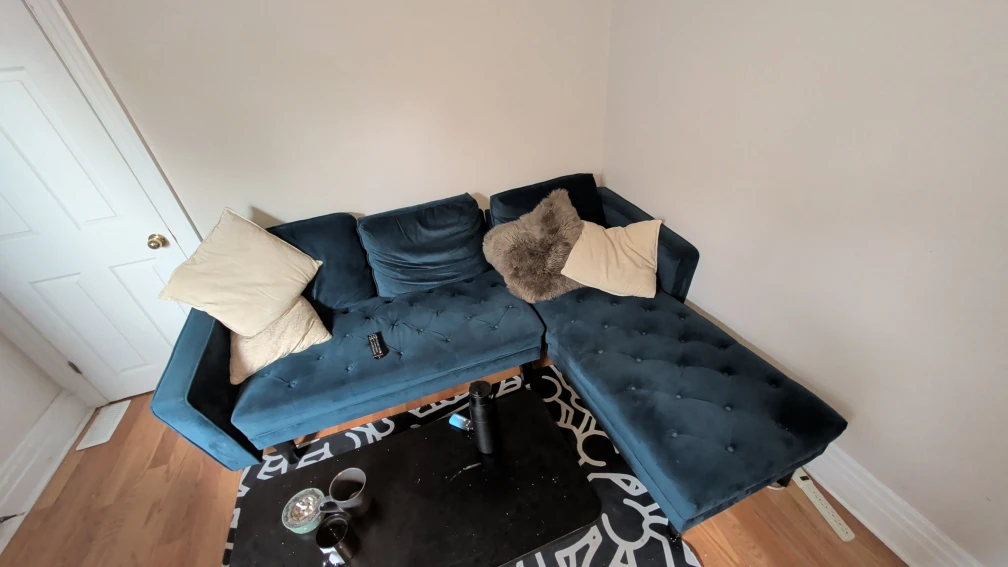 Selling a comfortable blue velvet sectional sofa. It's in great shape and would look lovely in any living room. Perfect for lounging and relaxing after a long day!