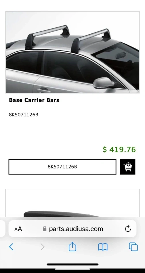Selling a set of Audi Base Carrier Bars, part number 8K5071126B. They are in great condition and come in the original box. Originally bought for $419.76