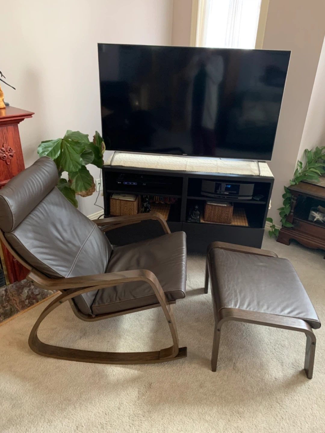 Selling a brown , faux leather rocking chair with a matching ottoman. It's perfect for relaxing after a long day!
