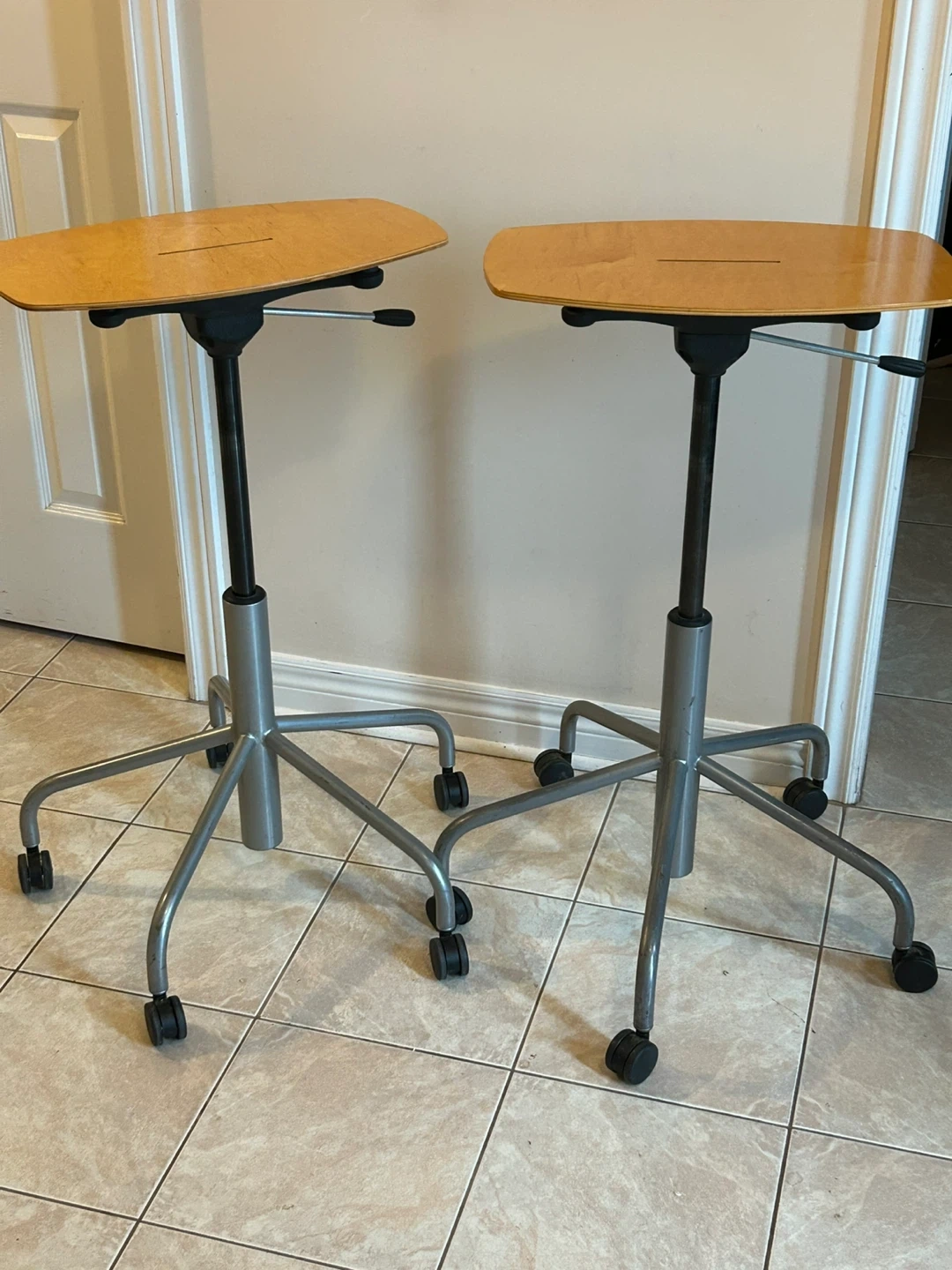 Two adjustable height rolling tables/chairs . These are great for standing desks or side tables. They're in good condition and ready to use!