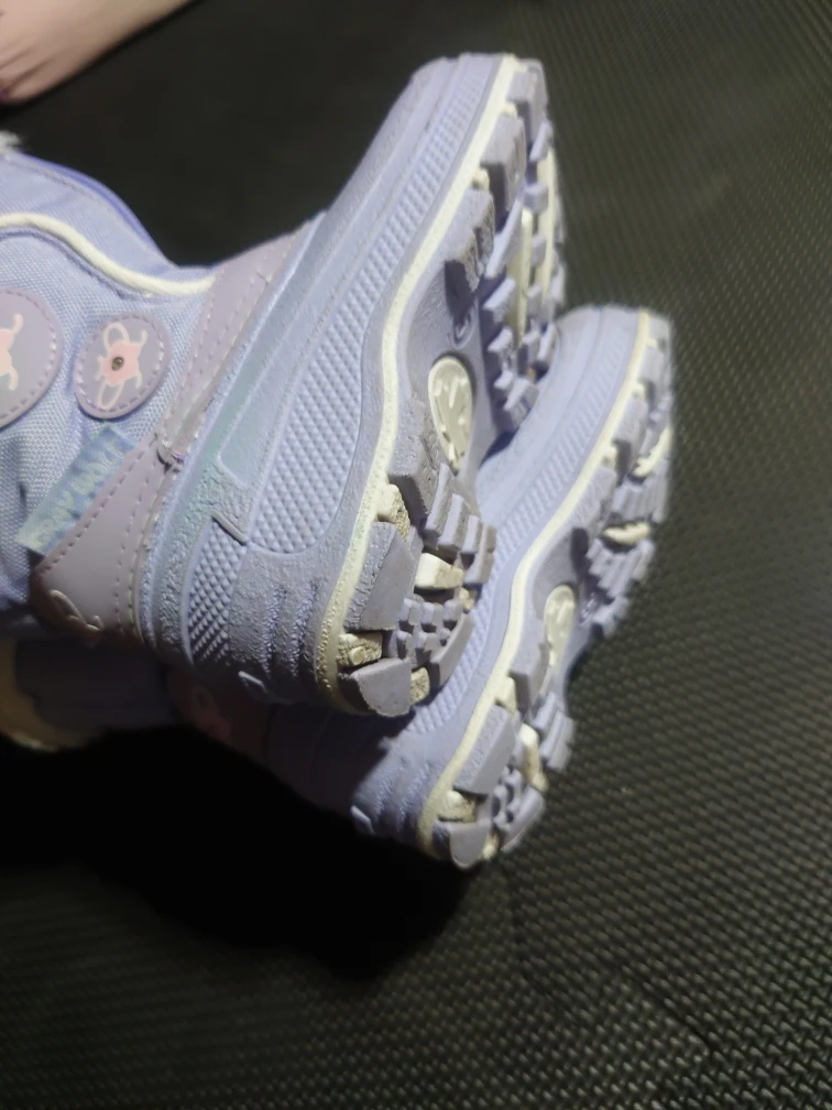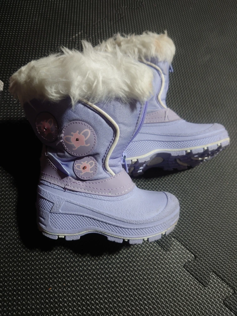 Here are a pair of girl's winter boots in a light purple colour. They're a size 5 and have a furry trim at the top. They're in good condition with some signs of wear on the soles.