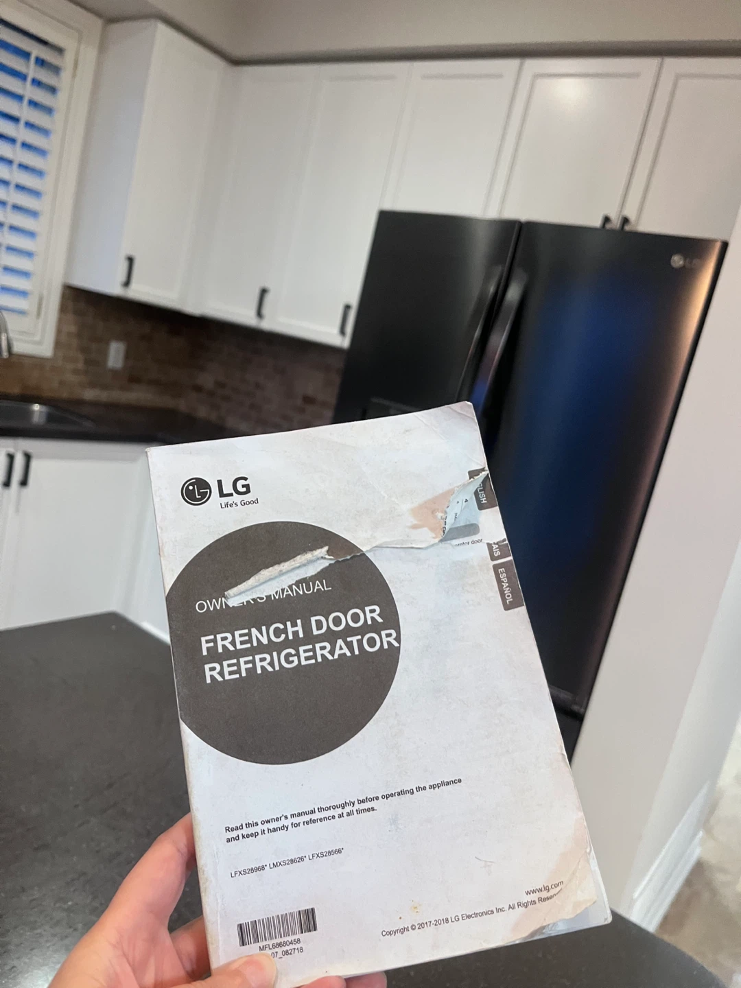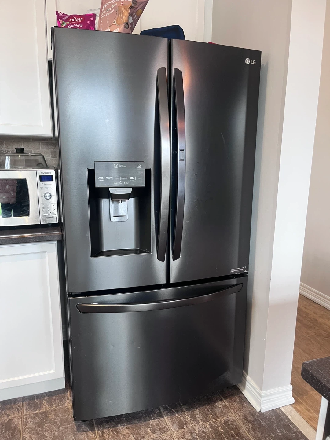 Selling an LG French door refrigerator in black stainless steel. It features a Linear Compressor and a Fresh Air filter. The fridge also has an Ice & Water System, including cubed and crushed ice options. It's in good condition and ready for a new home!