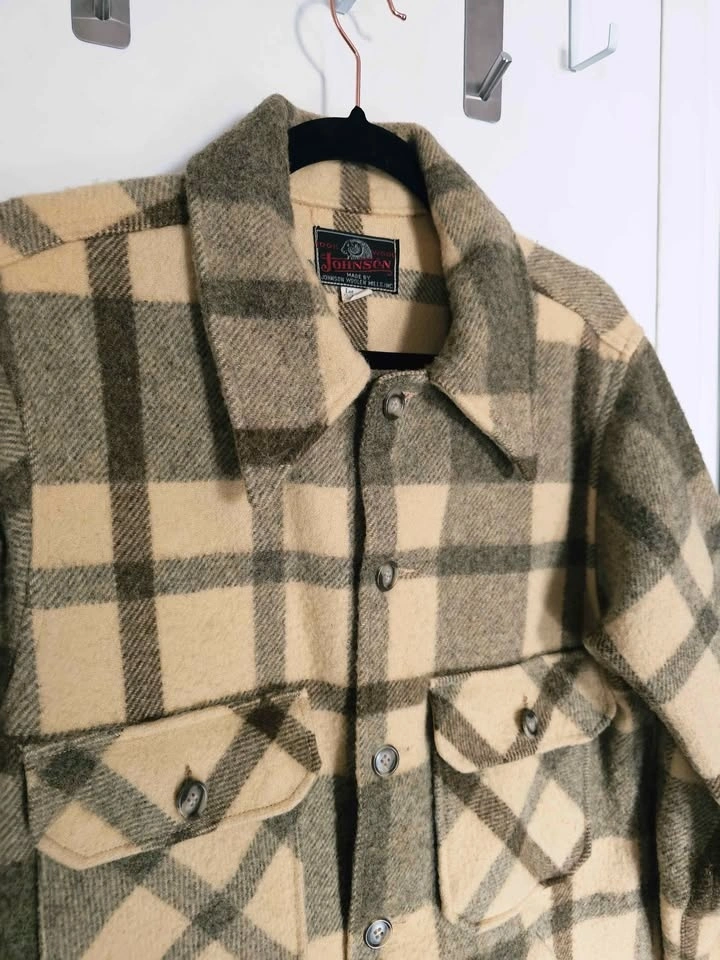 Jacket is made by Johnson Woollen Mills. It is in spectacular vintage condition and still looks like new. It has 2 patch pockets with button flaps at the chest, 2 side pockets, and brown tortoiseshell style buttons down the front and at the sleeve cuffs. Jacket is unlined.