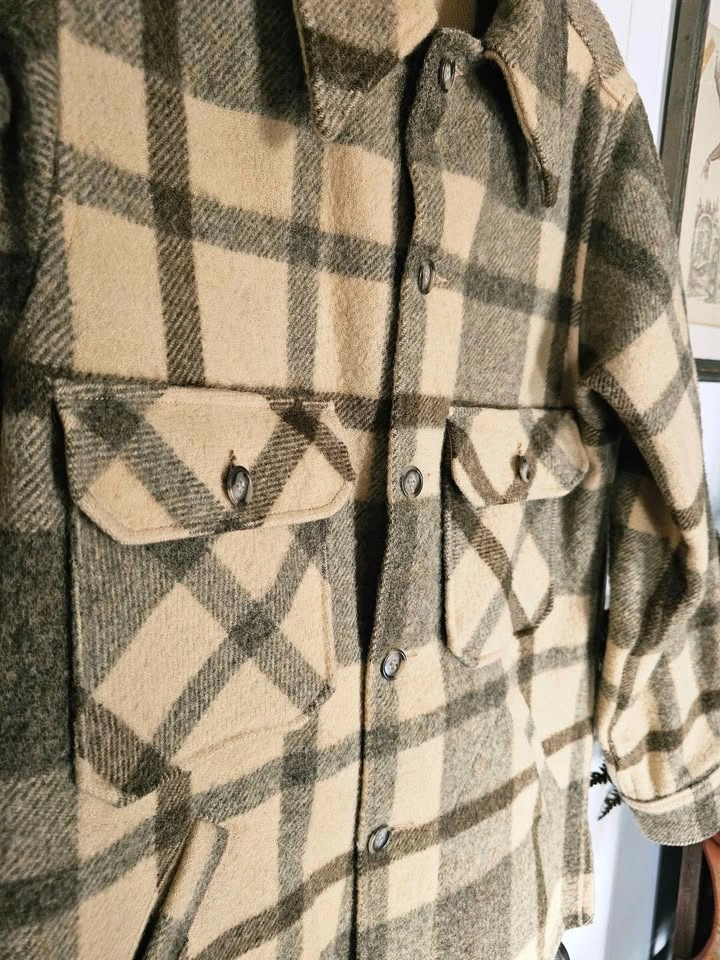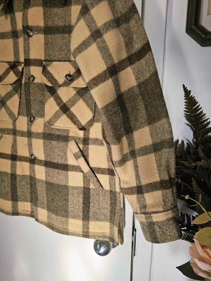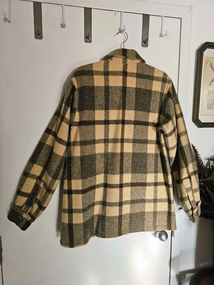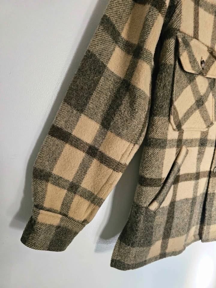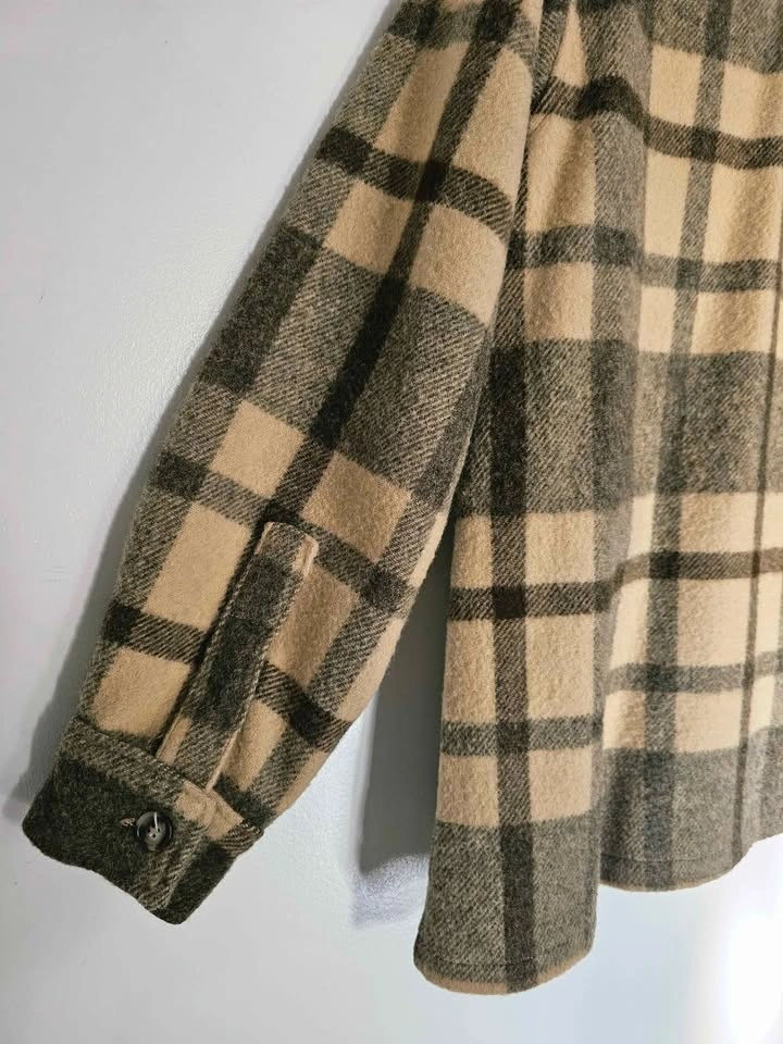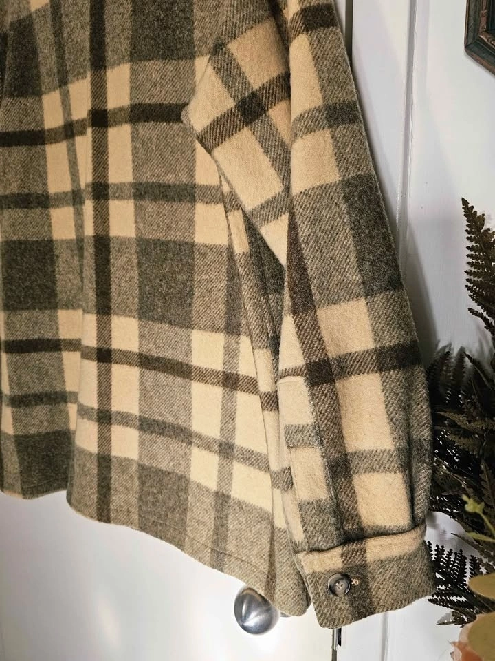 Vintage 1960s/ 1970s 100% wool heavy shirt jacket in a subdued beige/ cream and brown plaid pattern. This classic style is timeless and will never look outdated. The wool fabric is heavyweight and thick so it is very warm and cozy.