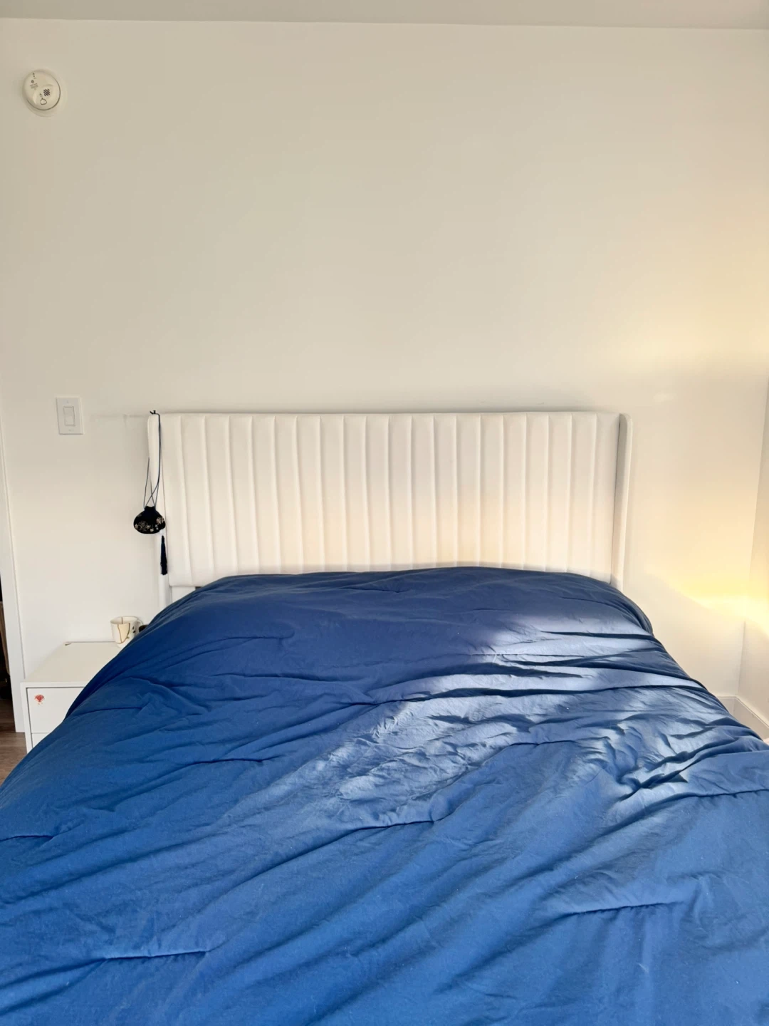 Selling a full-size bed that's in great condition! It features a stylish white headboard that adds a touch of elegance to any bedroom. The bed is sturdy and comfortable, perfect for a good night's sleep. If you're looking for a simple yet chic bed frame, this could be it!