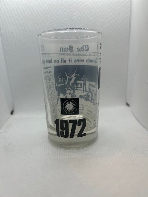 Each glass showcases headlines from significant moments such as WWII coverage, the Coronation of Queen Elizabeth II, and Canada’s legendary hockey victory in the 1972 Summit Series.