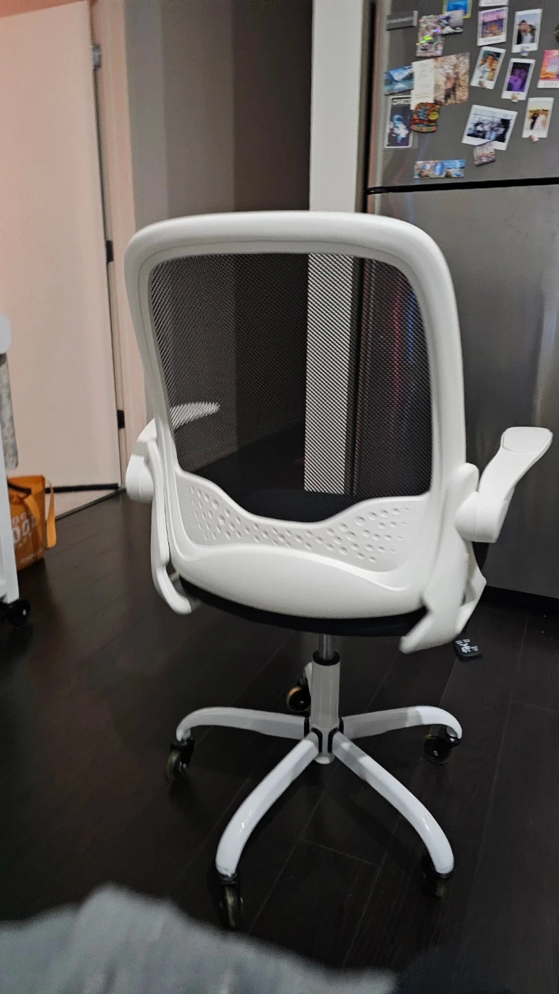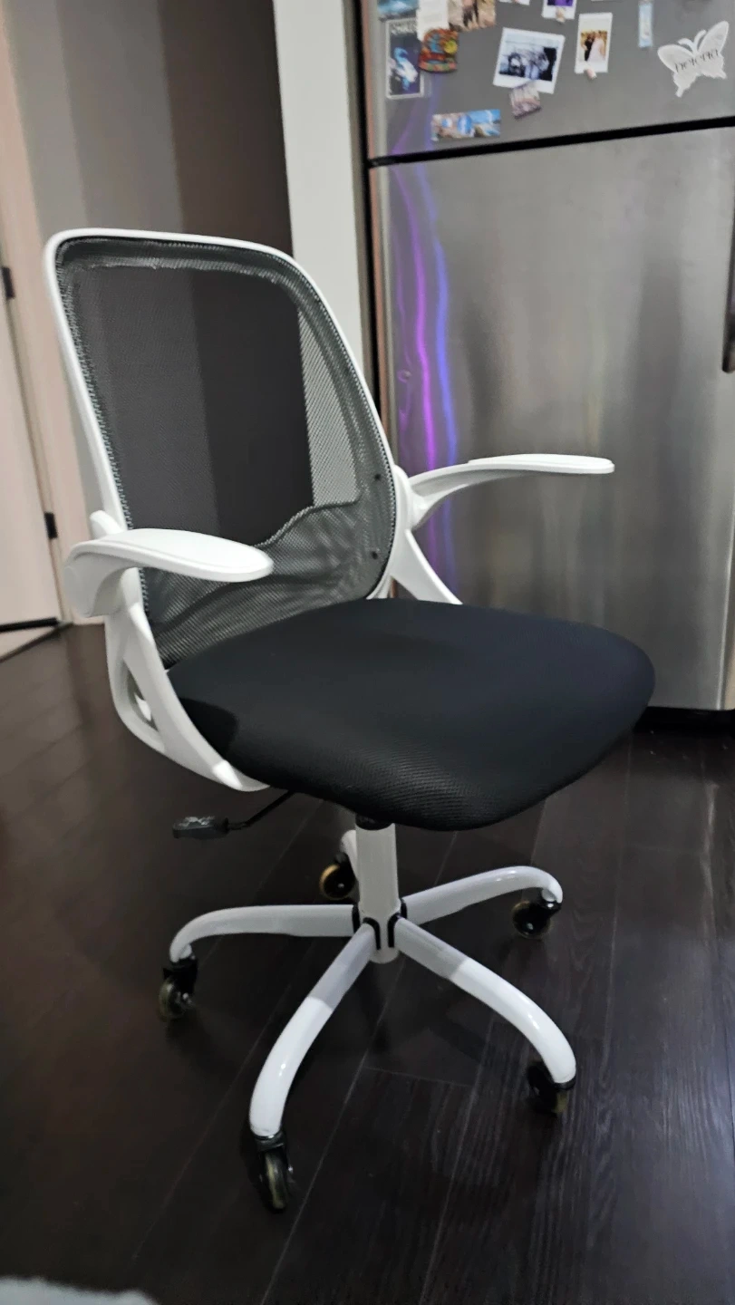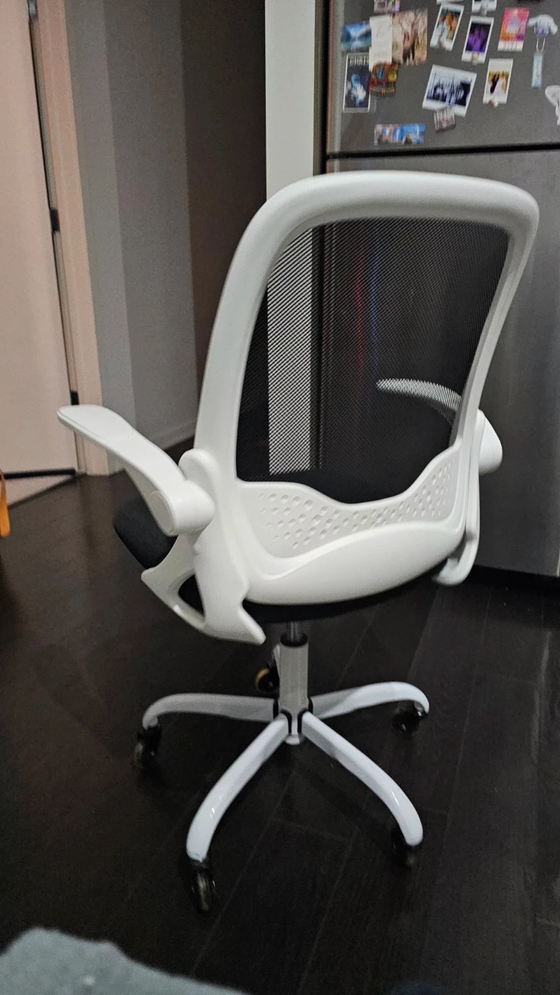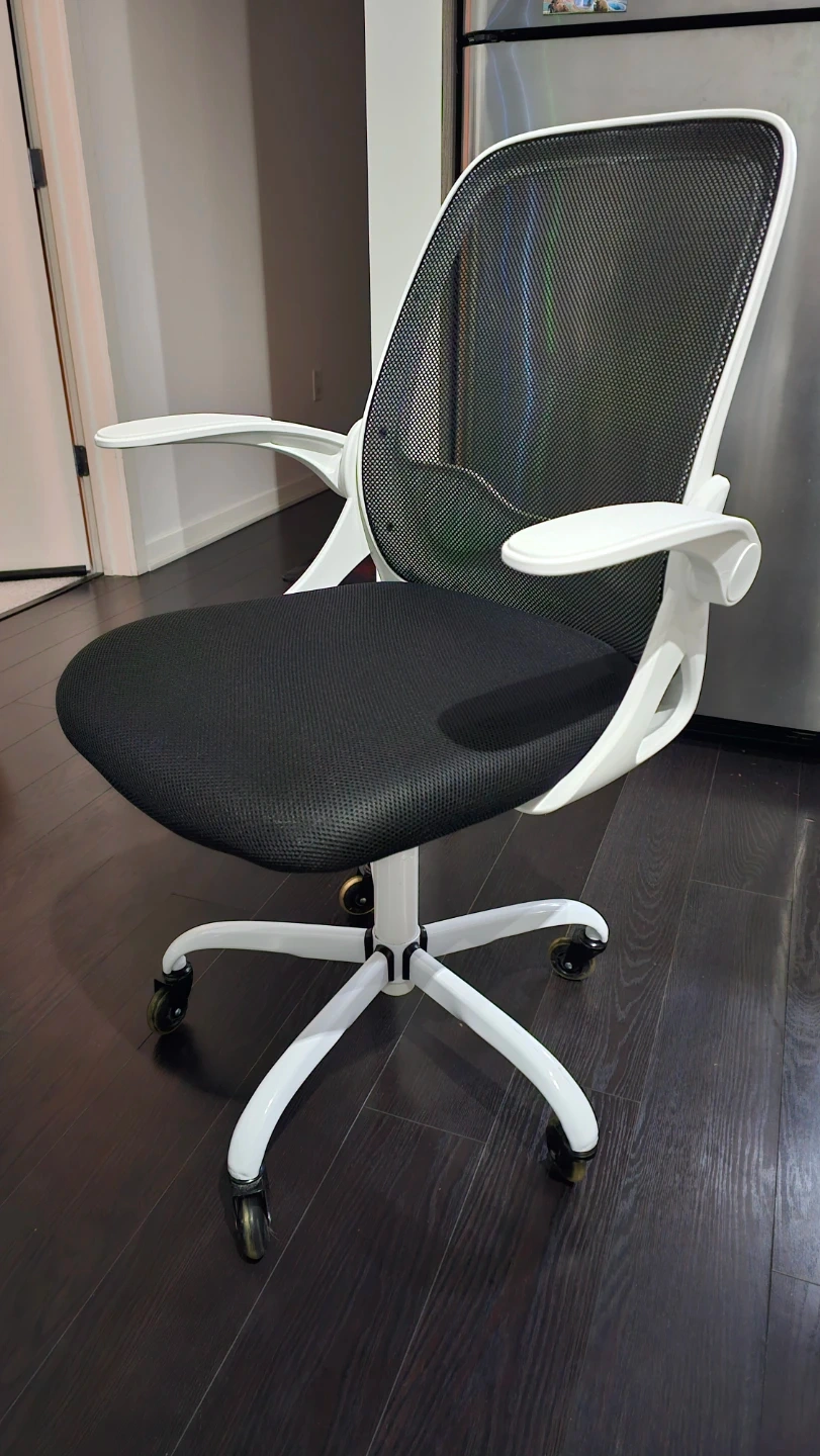 Selling a comfortable office chair with a mesh back and a black seat. The frame is white, and it's in great condition. Perfect for your home office or study space!