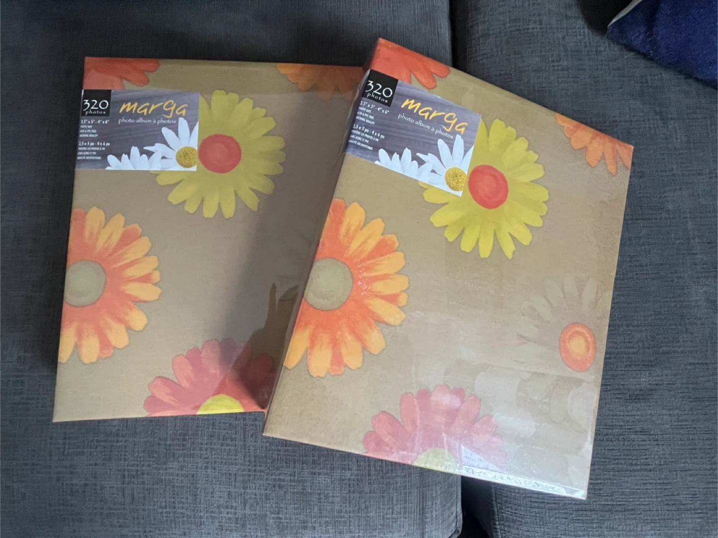 Two photo albums; each holds 320 photos. It's designed for photos sized 3.5"x5" - 4"x6". The album has a cute floral design on the cover. One has slight damage on front cover. The other like new. Price is for both