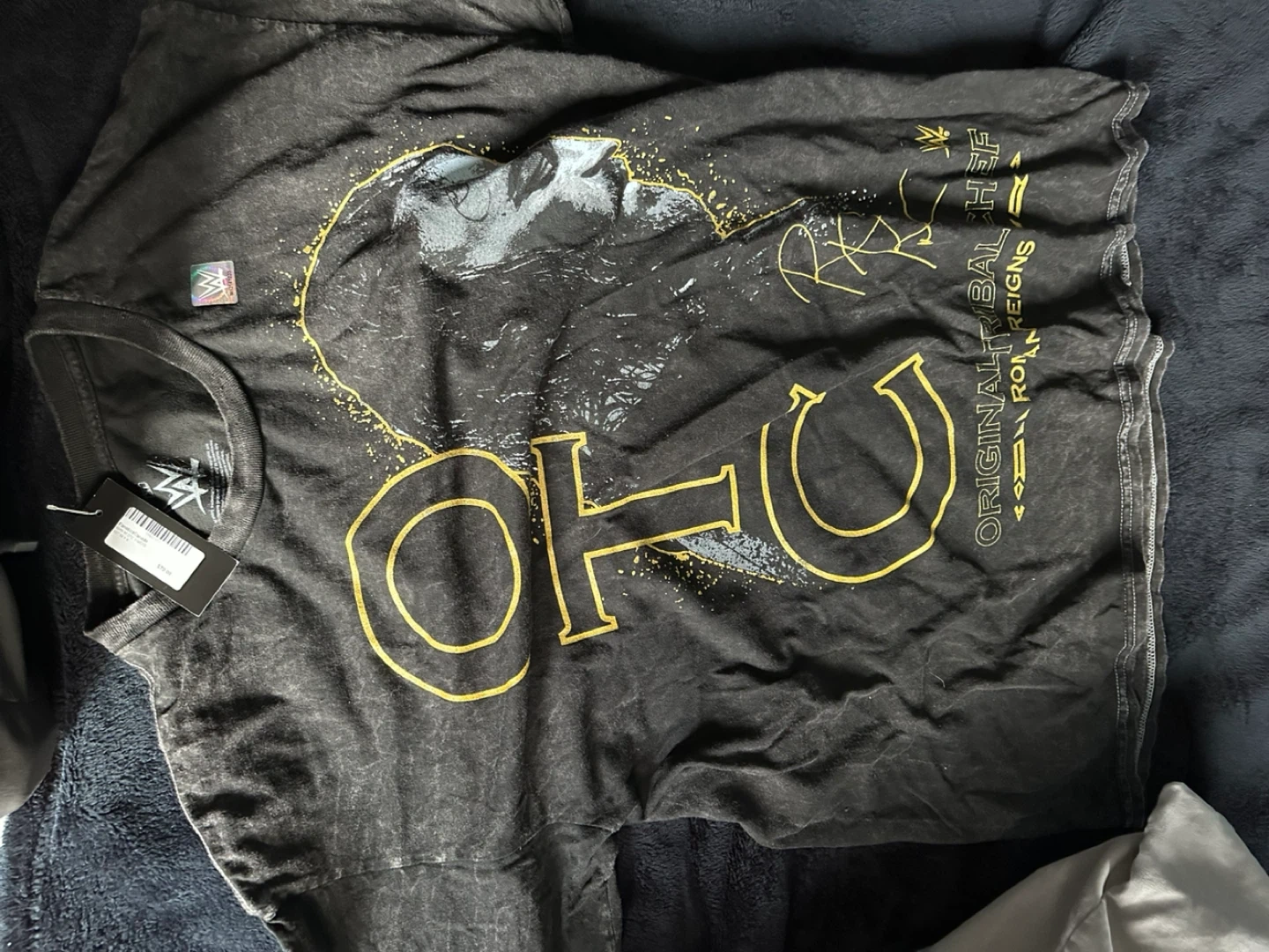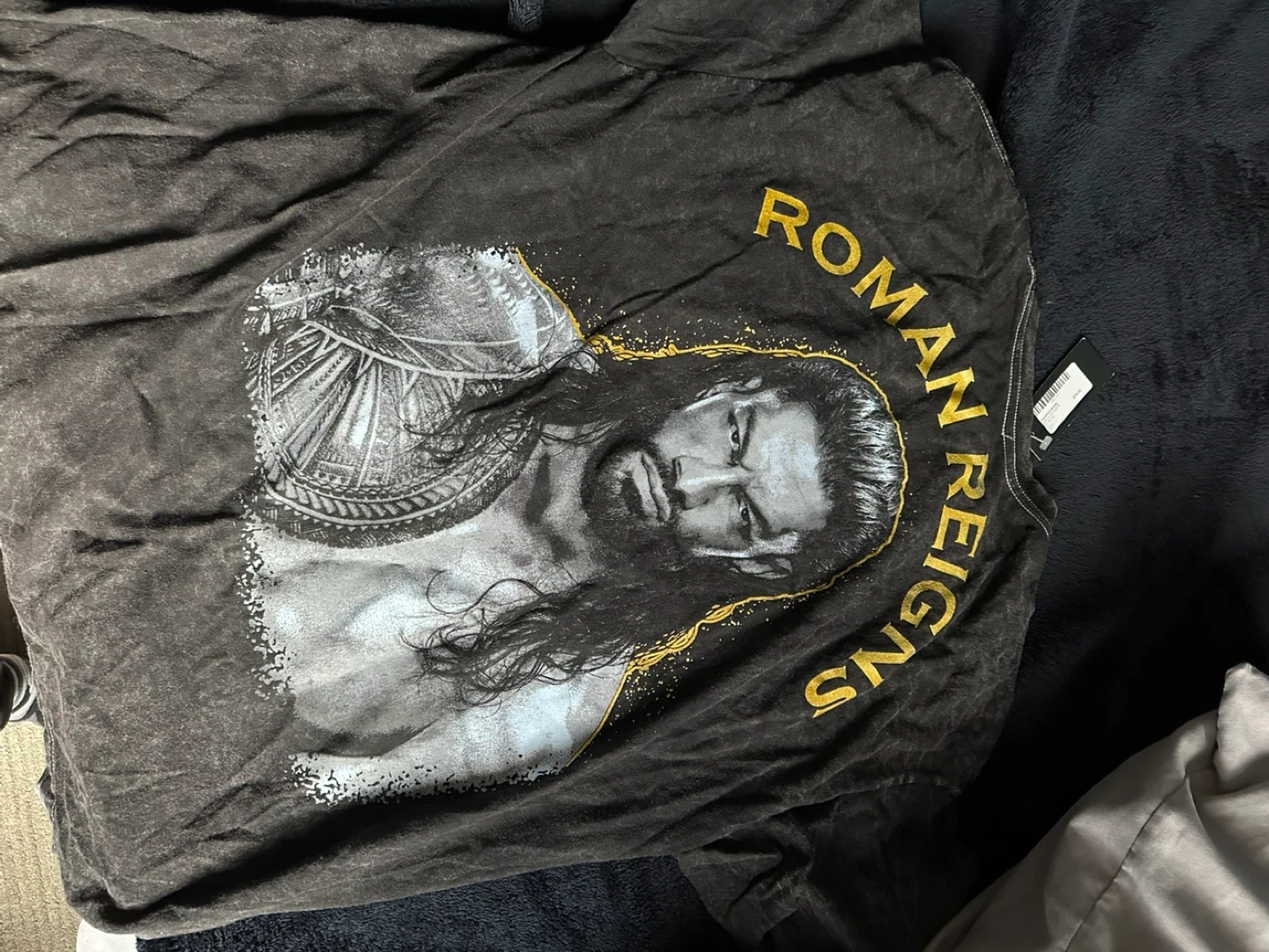 Selling a WWE Roman Reigns t-shirt! The shirt is a dark grey colour with yellow lettering. It features a graphic of Roman Reigns on the front and the words "Original Baller Chief Roman Reigns" on the back. Perfect for any wrestling fan!