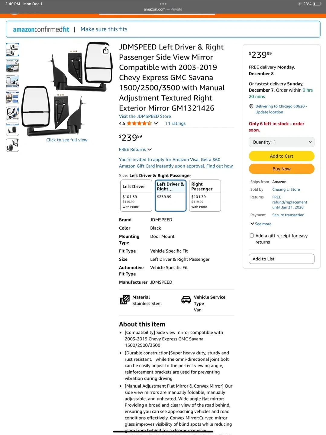 Selling a pair of JDMSPEED side view mirrors compatible with 2003-2019 Chevy Express GMC Savana 1500/2500/3500 models. They feature manual adjustment and a textured right exterior.