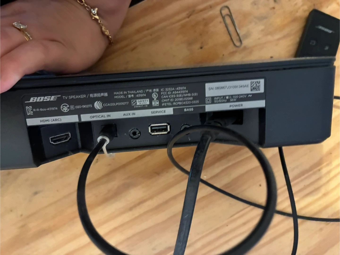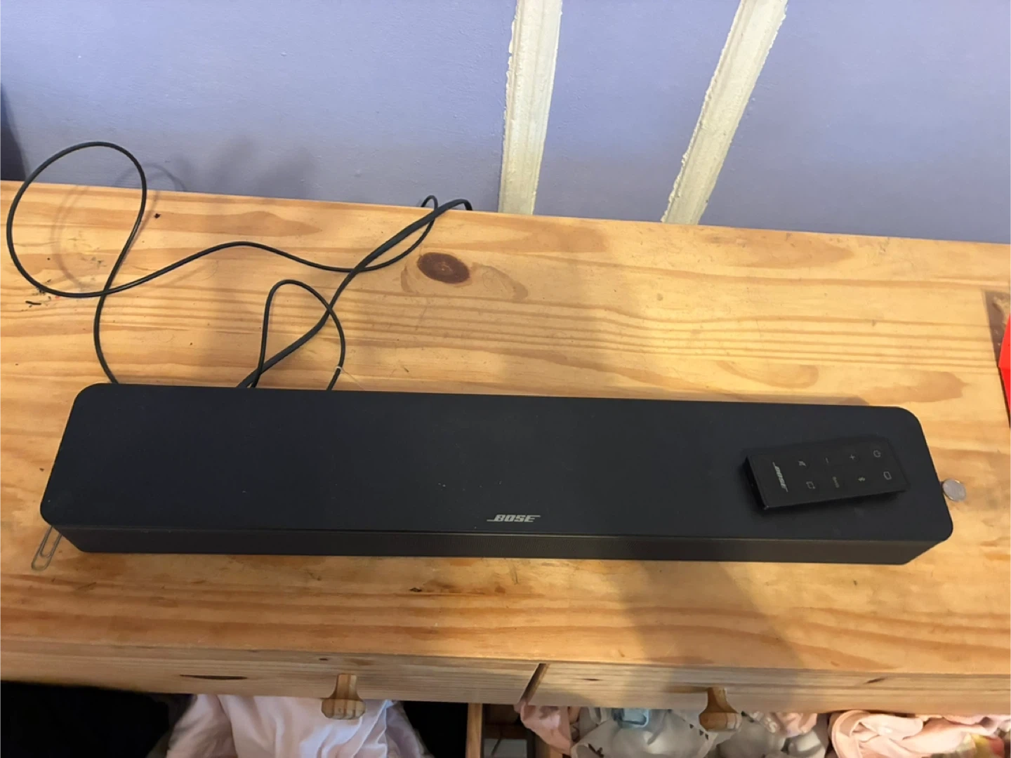 This is a Bose TV speaker soundbar. It's black and includes a remote. Connects via HDMI ARC, Optical, or AUX.