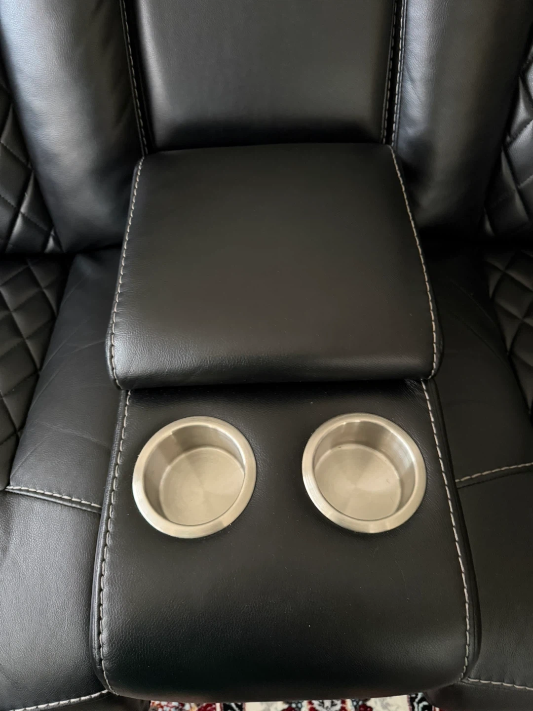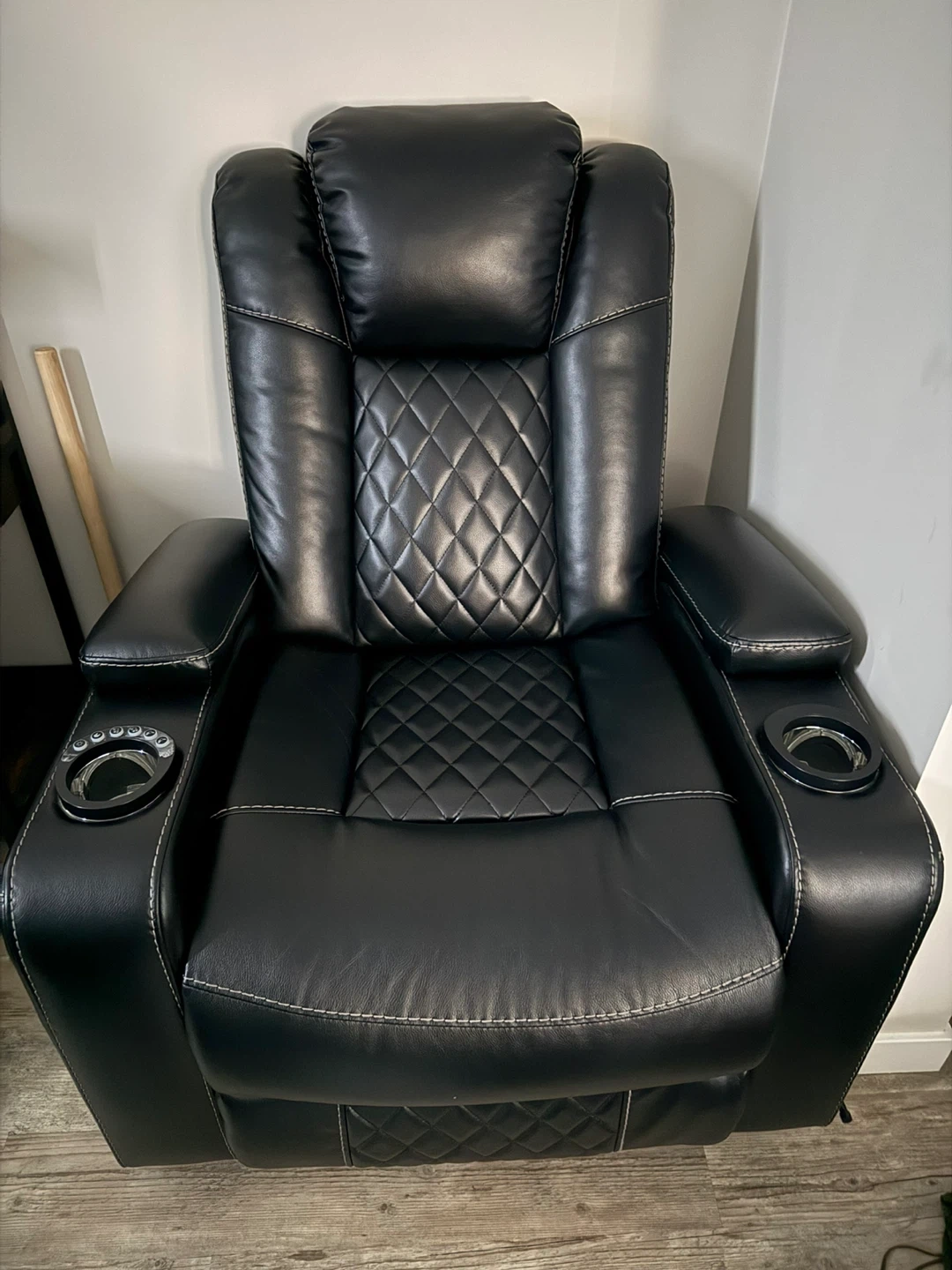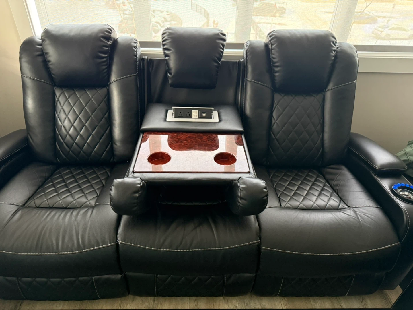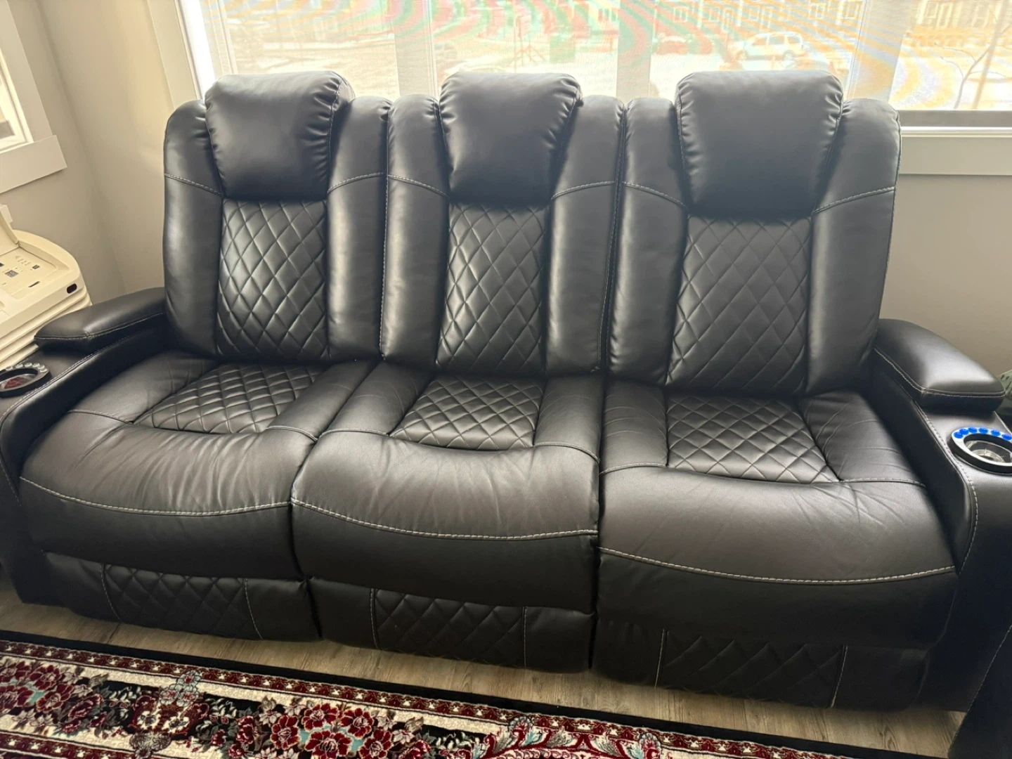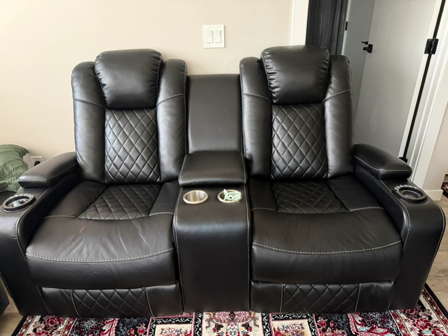Selling a set of black leather home theatre reclining seats. It features diamond stitching and built-in cup holders. There's also a centre console with power outlets and USB ports for added convenience. Perfect for creating a cozy and functional entertainment space!