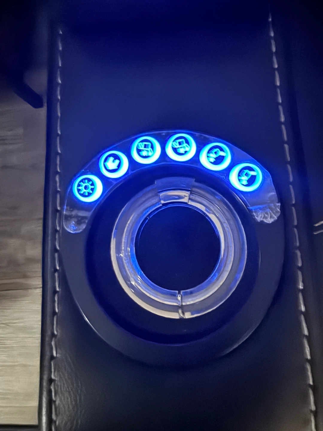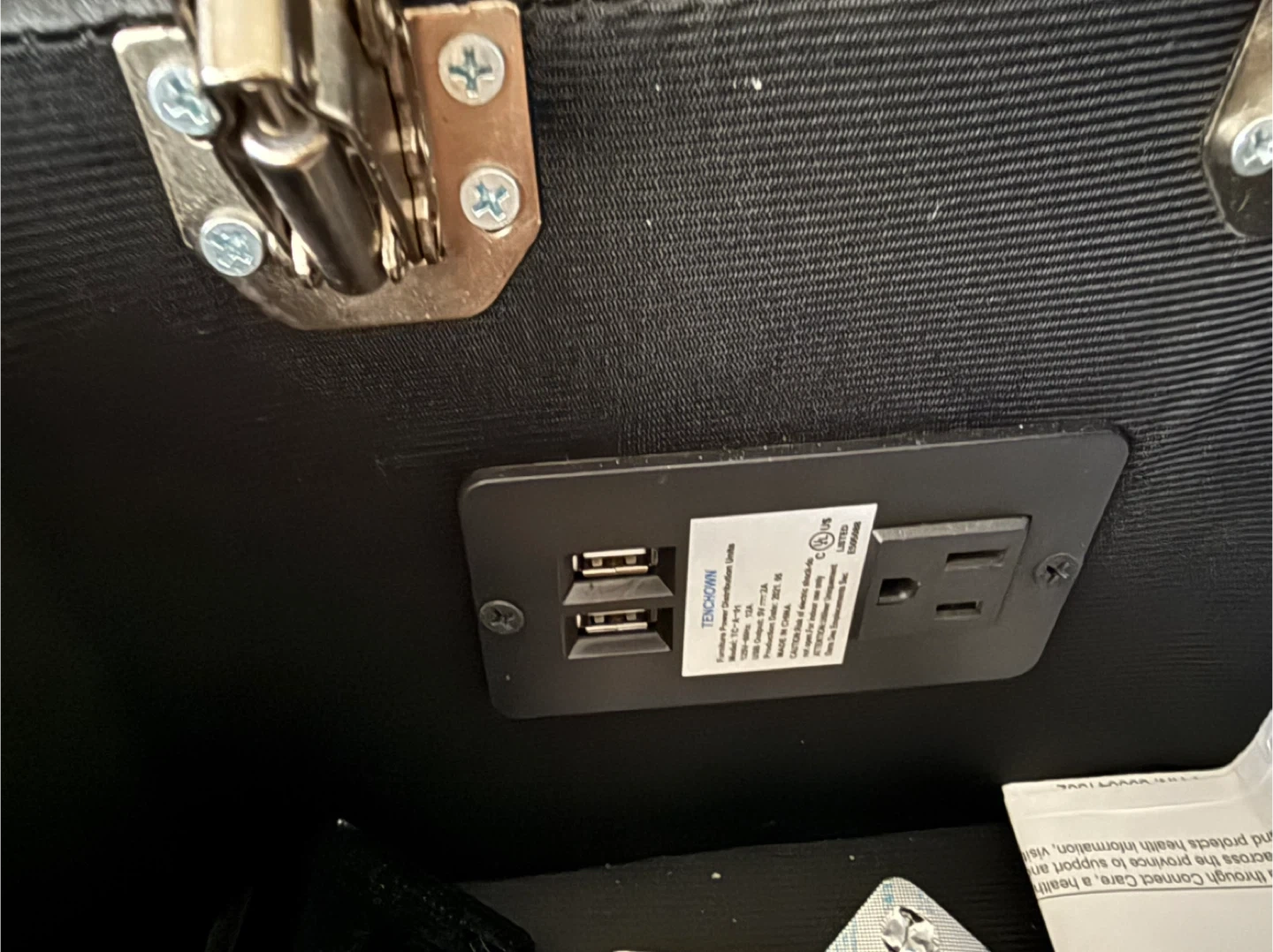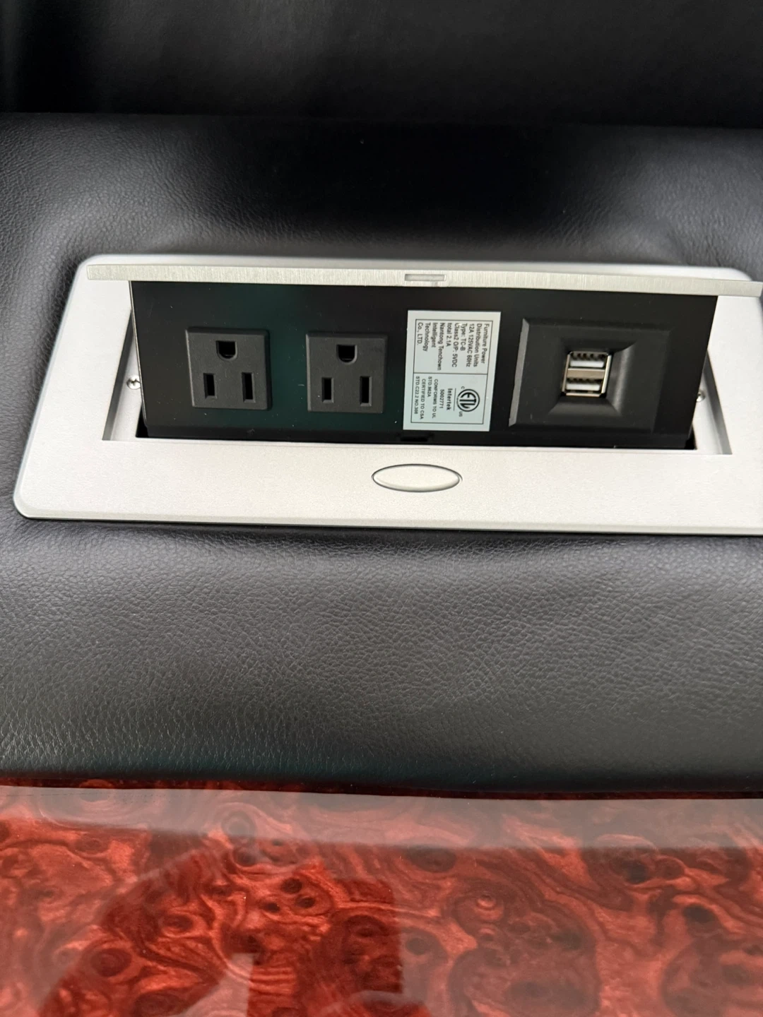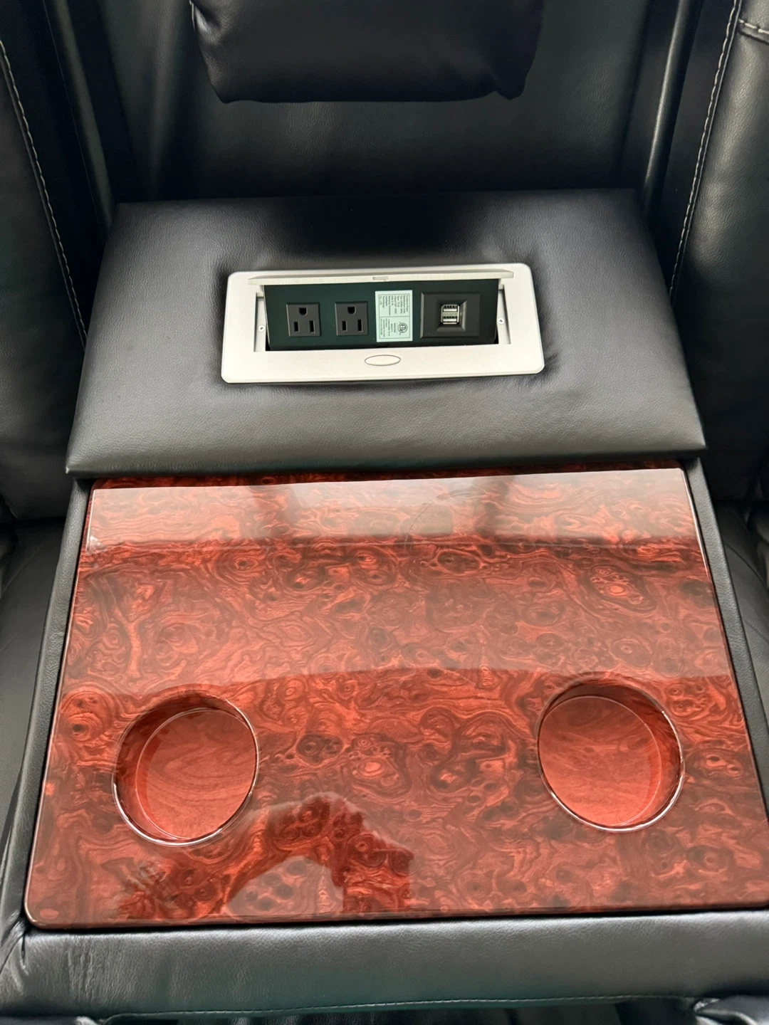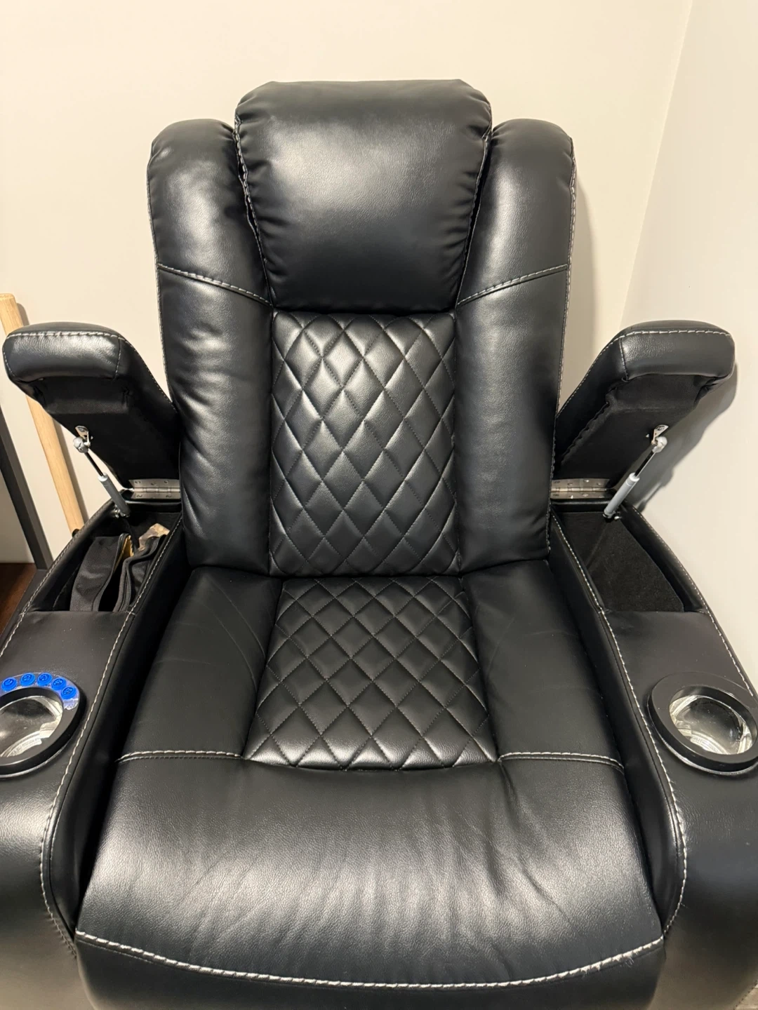 Selling a set of black leather home theatre reclining seats. It features diamond stitching and built-in cup holders. There's also a centre console with power outlets and USB ports for added convenience. Perfect for creating a cozy and functional entertainment space!
