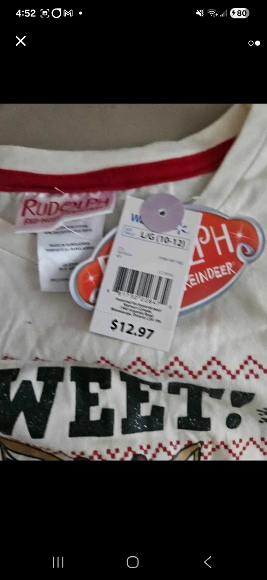 This is a Rudolph the Red-Nosed Reindeer t-shirt for girls. It's a size L (10-12) and features a cute Rudolph design. It's new with tags and the original price was $12.97