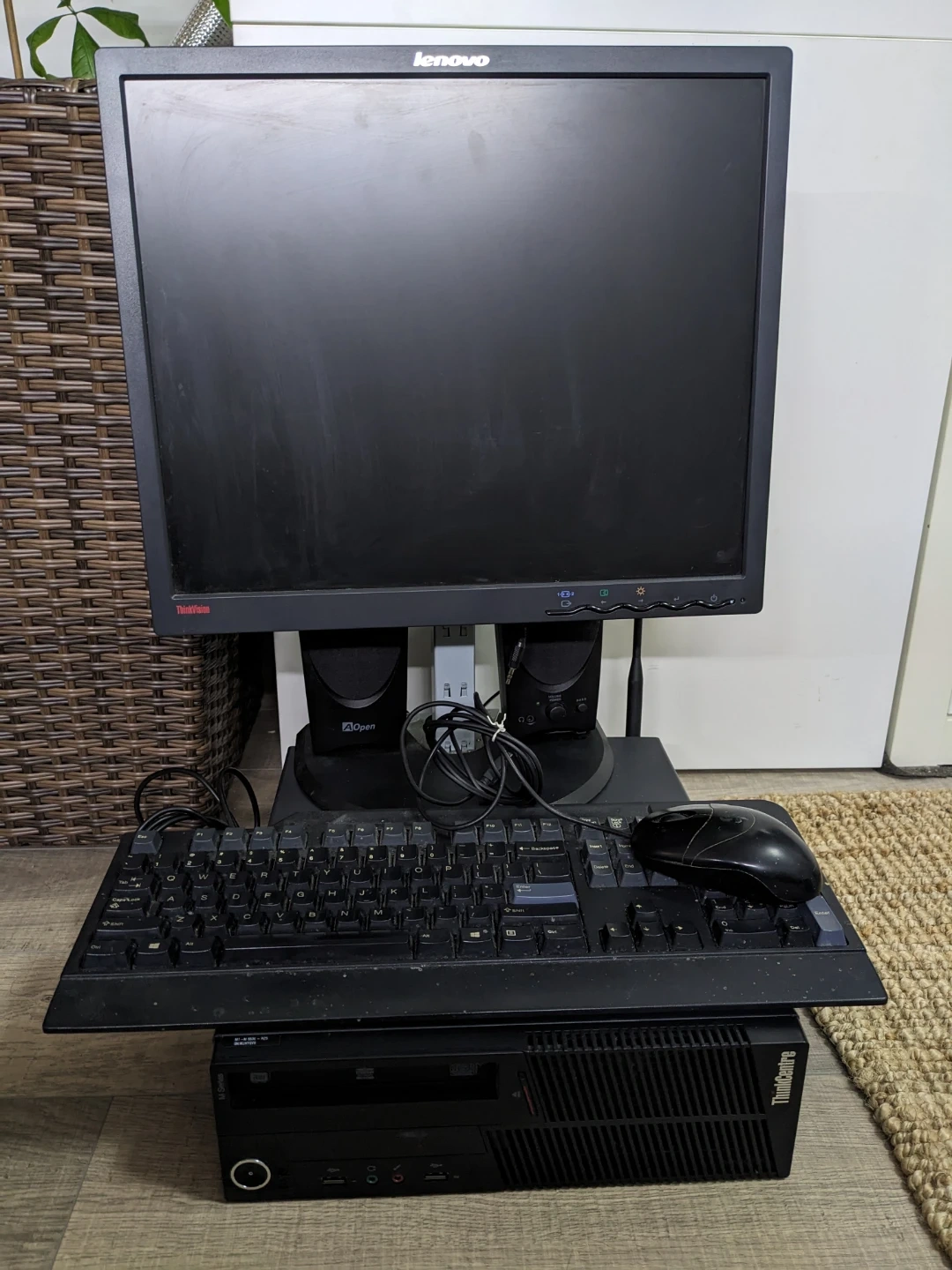 Selling a Lenovo ThinkCentre desktop PC with a monitor, keyboard, and mouse, speakers. It's all in good working condition and ready for a new user. The model number on the PC is