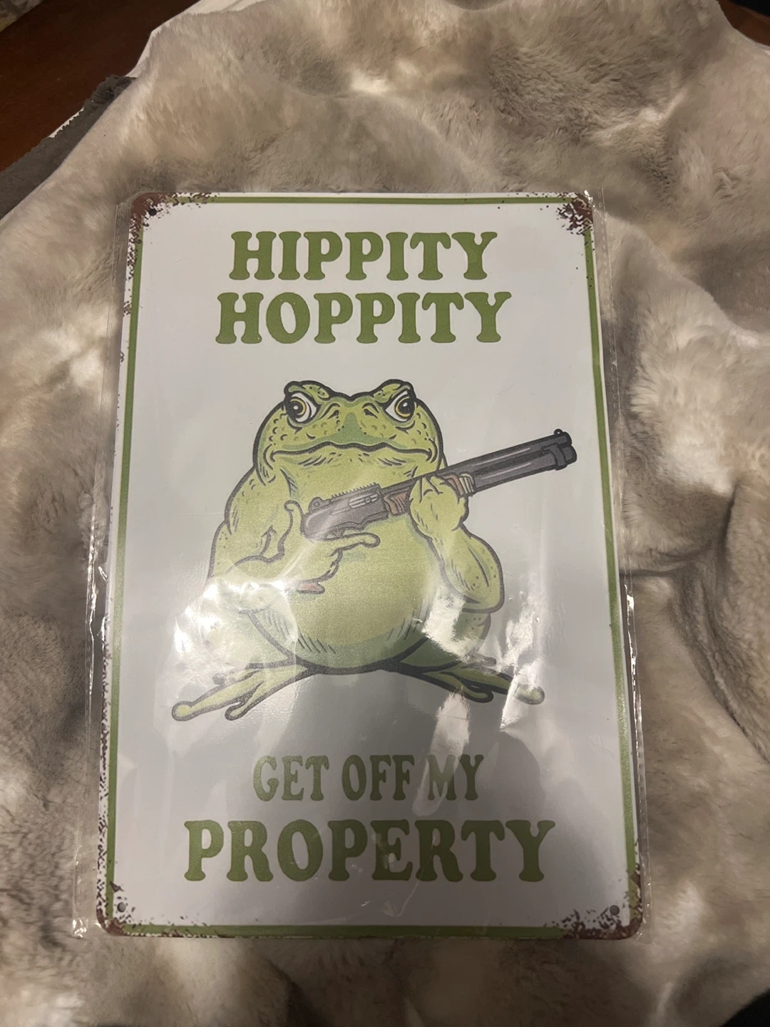 Selling a metal sign that says "Hippity Hoppity Get Off My Property" with a frog holding a shotgun. It's new and still in the packaging!