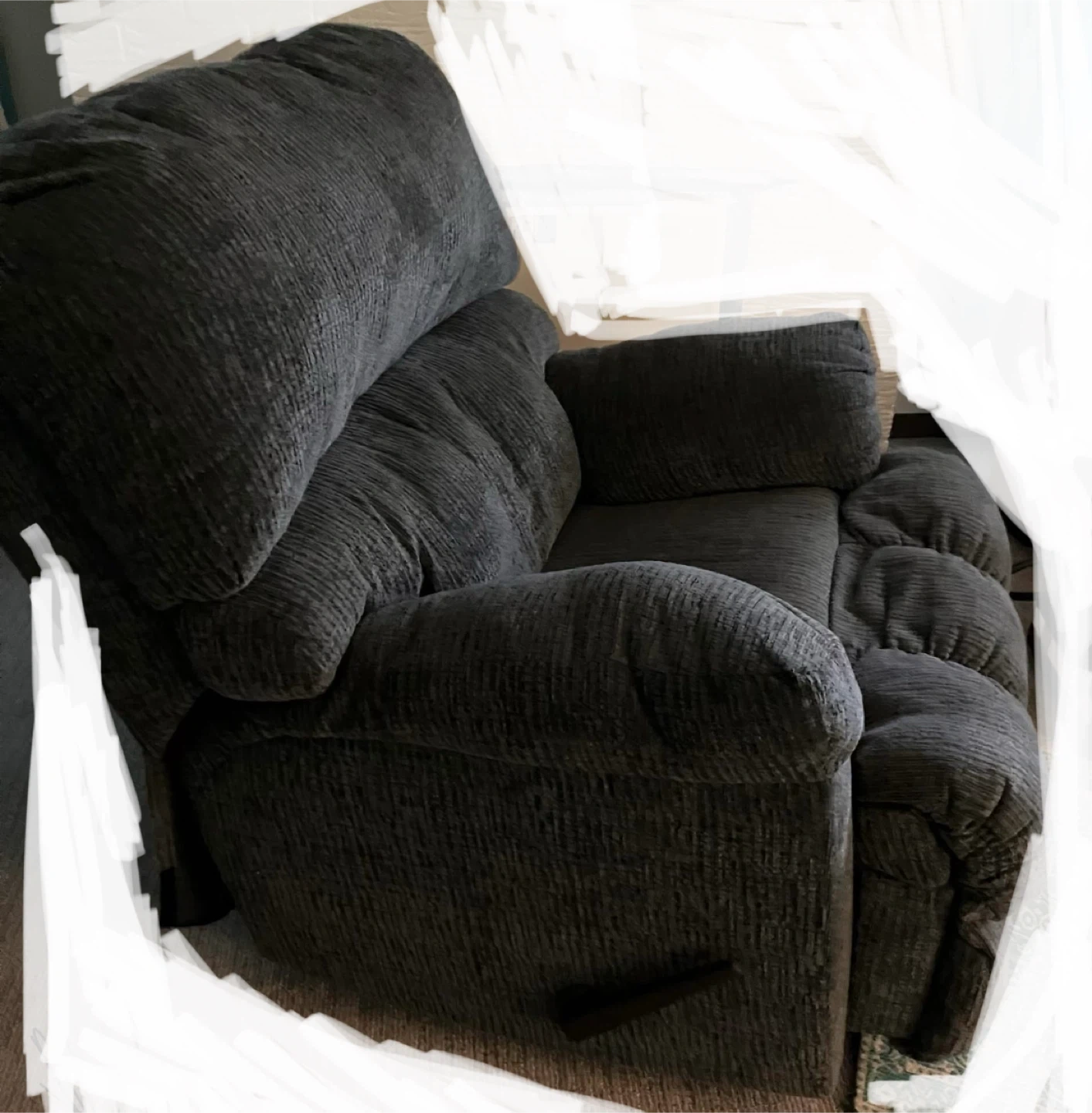 Selling a comfy gray recliner chair. It's perfect for relaxing after a long day! The chair is in new condition. It's a great addition to any living room or entertainment space!