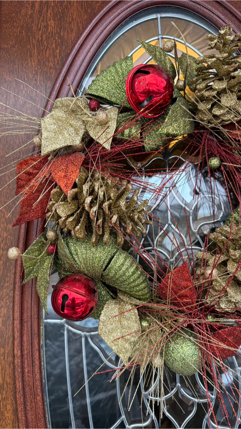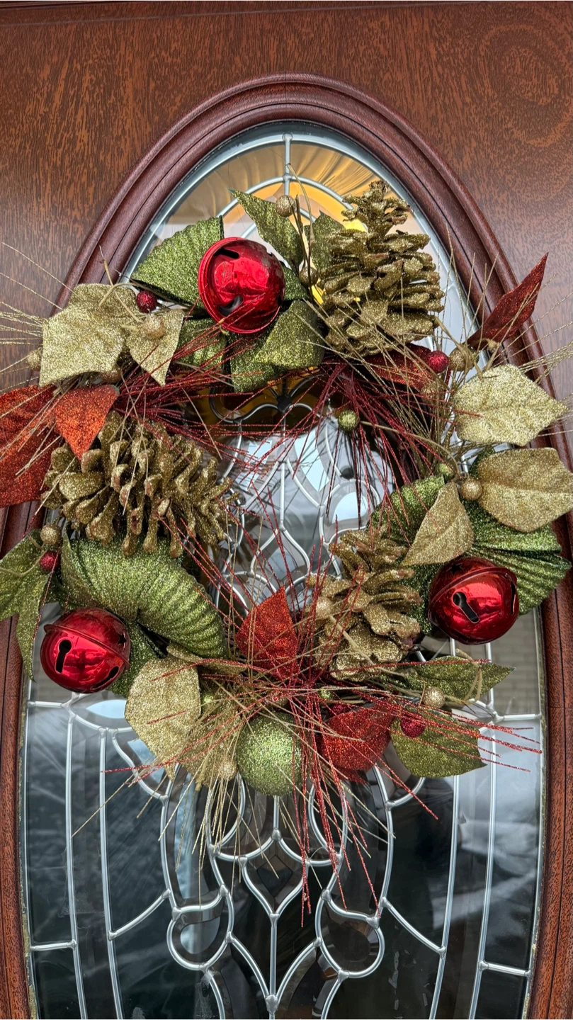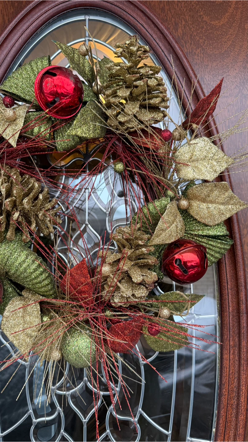 Selling a beautiful holiday wreath! It's decorated with red, green, and gold ornaments and accents. Perfect for adding a festive touch to your door or wall this season