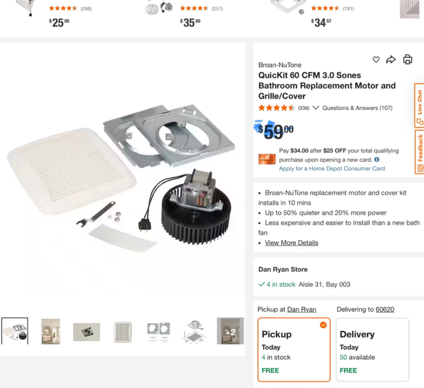 Selling a Broan-NuTone QuickKit 60 CFM 3.0 Sones Bathroom Replacement Motor and Grille/Cover. It's designed for easy installation and is less expensive than installing a new bath fan. Up to 50% quieter and 20% more power