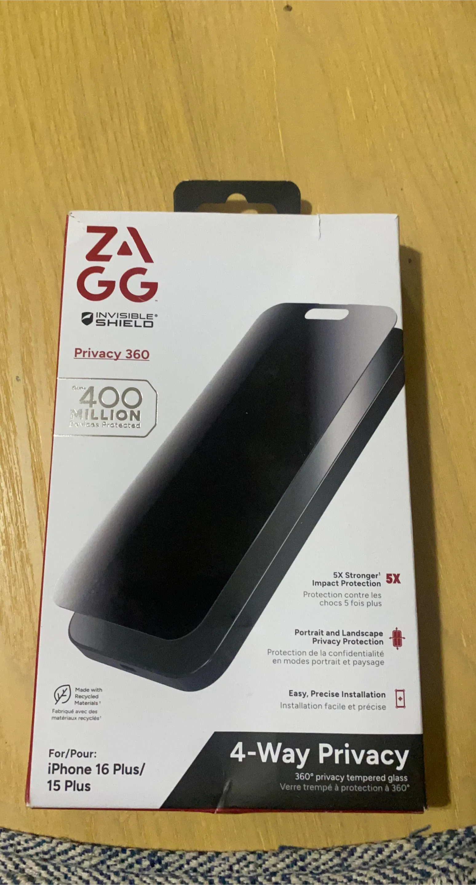 Selling a ZAGG InvisibleShield Privacy 360 screen protector! It's designed for the iPhone 16 Plus and 15 Plus models. This screen protector offers 4-way privacy with 360° tempered glass protection. It's also 5X stronger for impact protection and made with recycled materials!