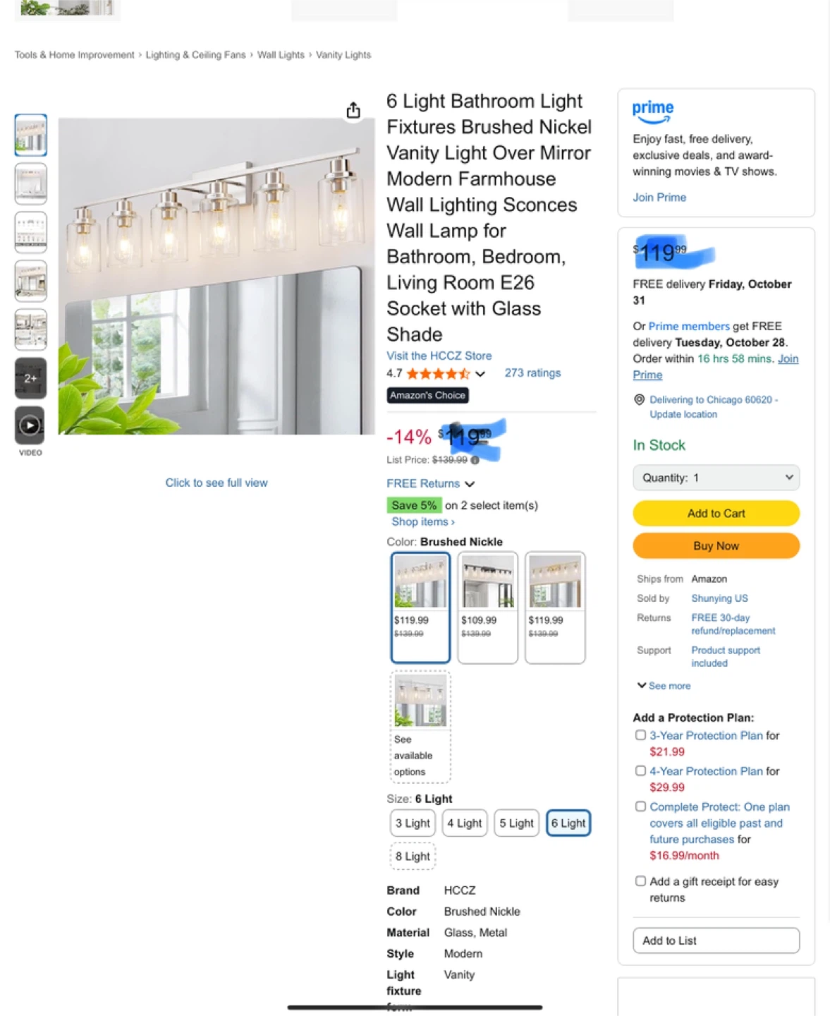 Selling a 6 Light Bathroom Light Fixture in brushed nickel. It's a vanity light over mirror modern farmhouse wall lighting sconces wall lamp for bathroom, bedroom, living room E26 socket with glass shade. Originally bought for $119.99
